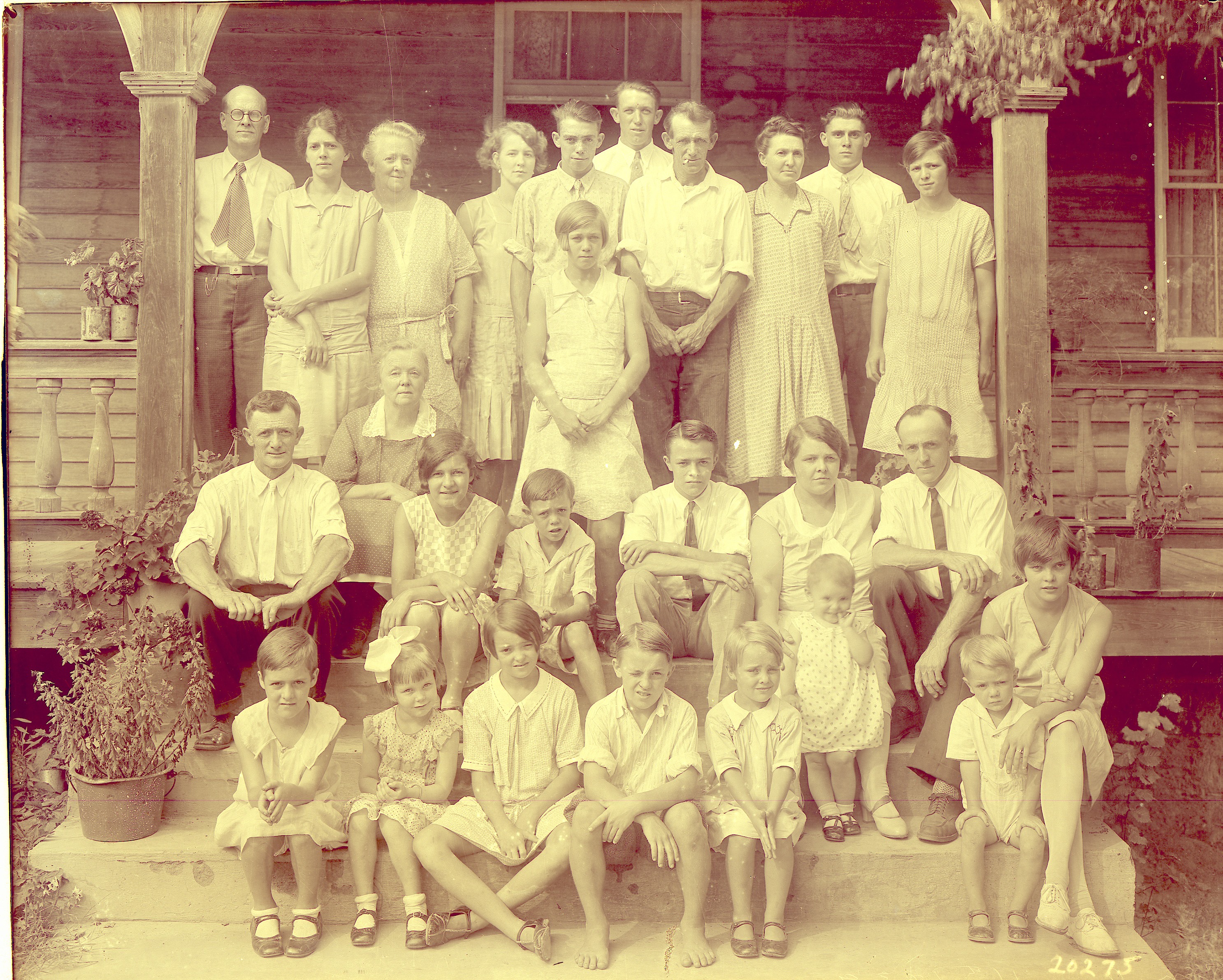Large group of unidentified men, women, and children posed together on the steps of a porch.