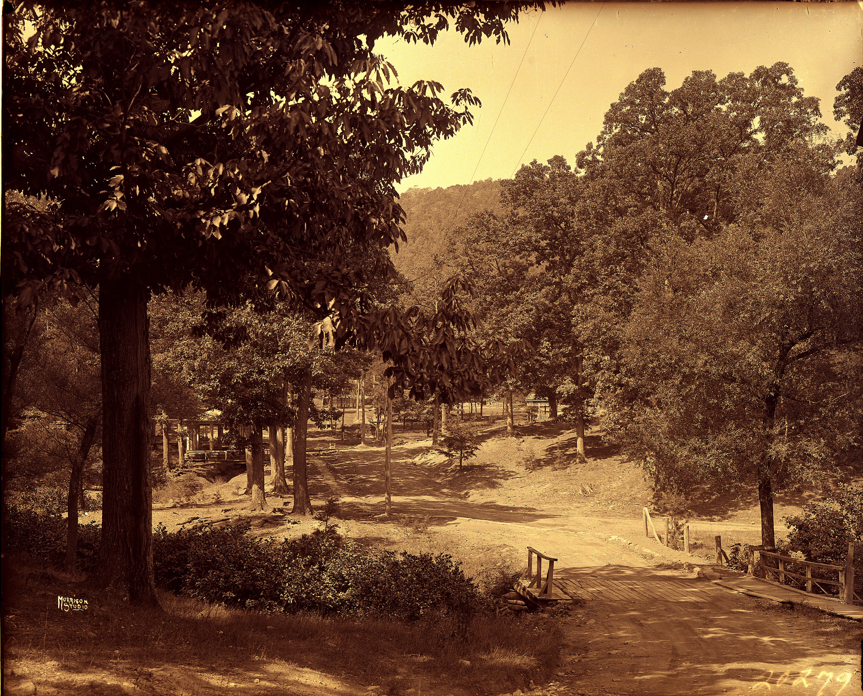 Unidentified rural scene with a small wooden bridge, dirt road, trees, and a few unidentified buildings or picnic pavilions in the background.