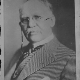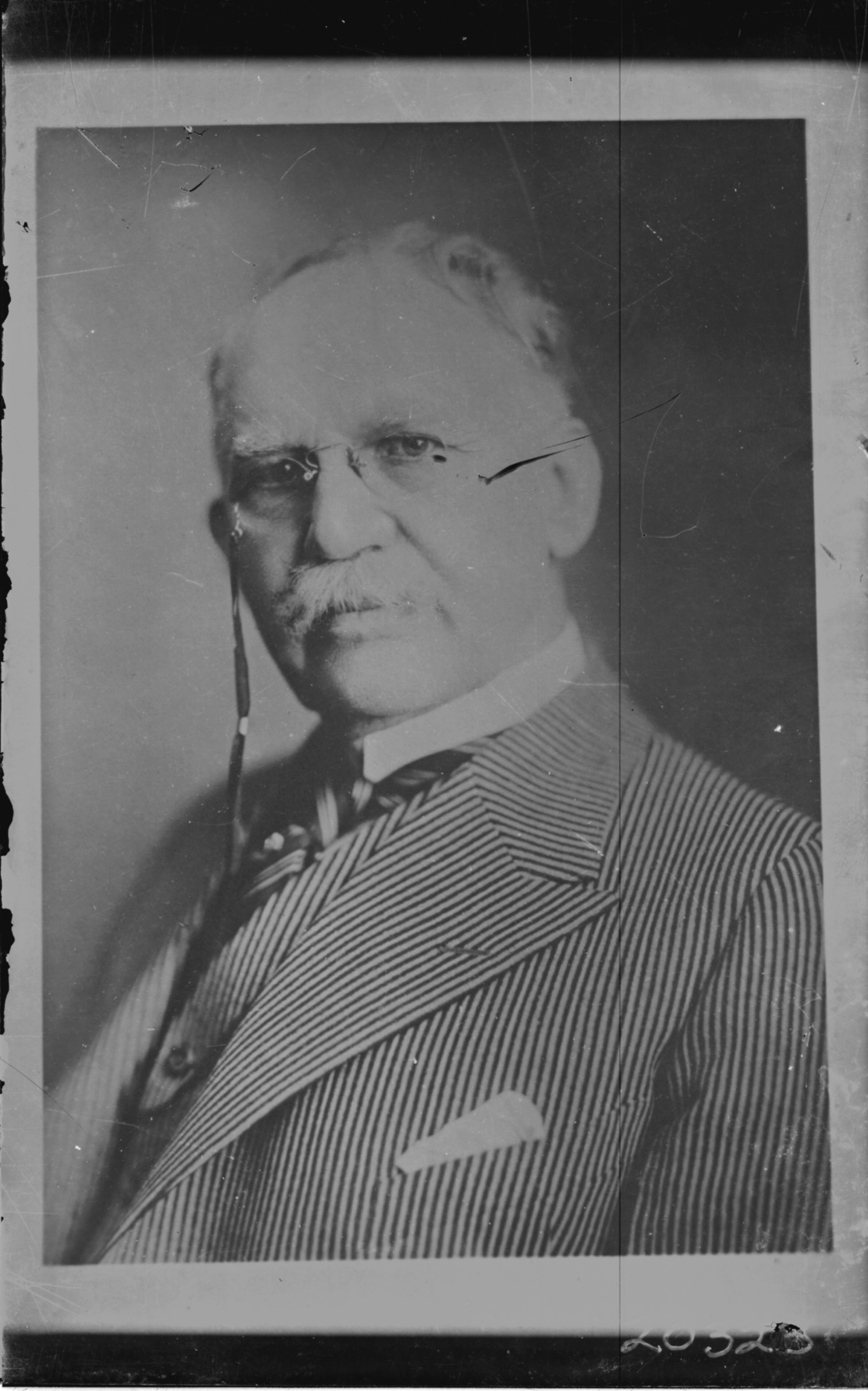 Photo pf a photograph of an unidentified older man with glasses and wearing a striped suit and tie.