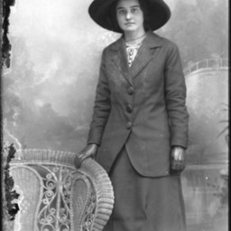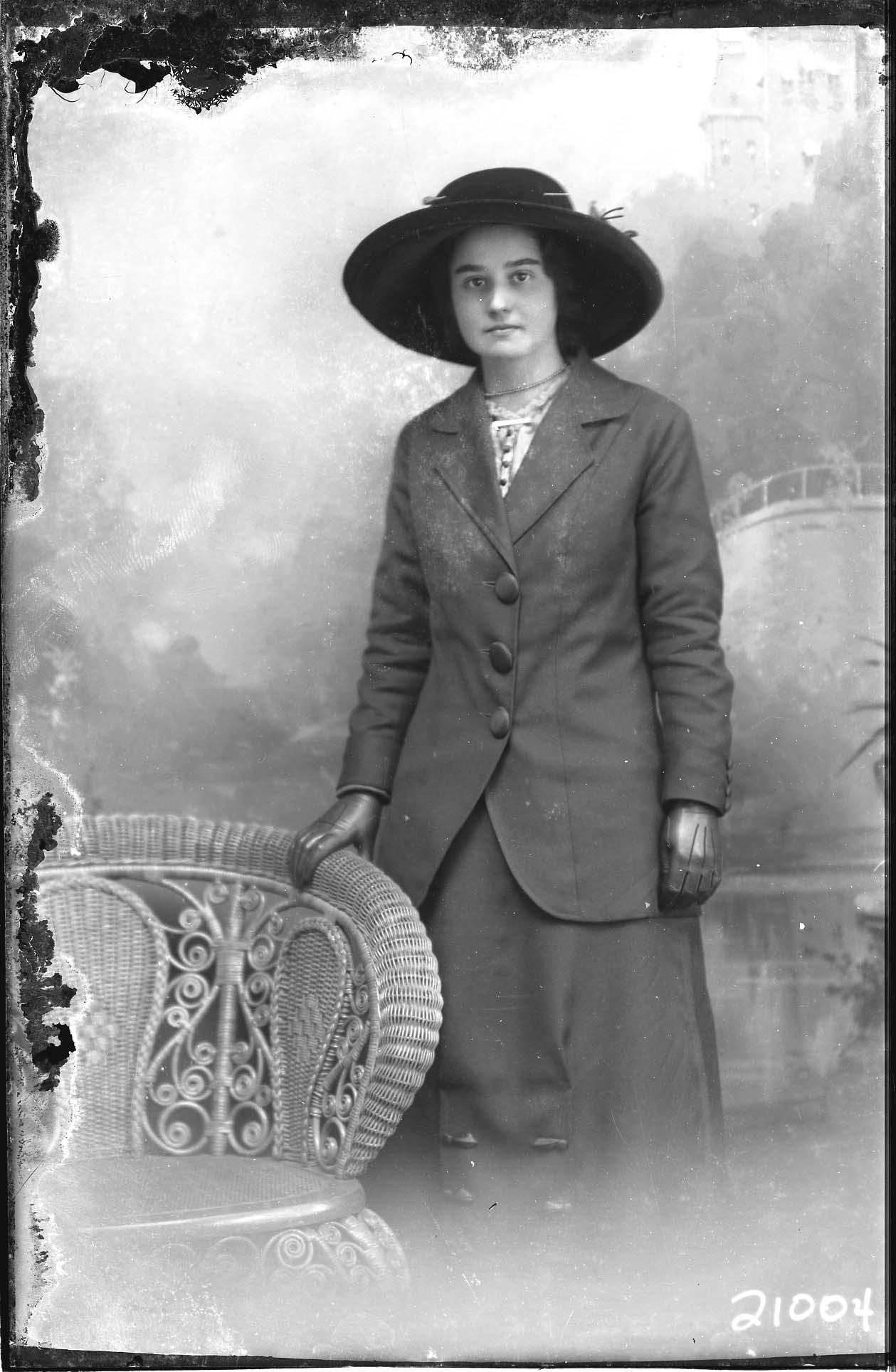 Unidentified woman is standing by a wicker chair and wearing a wide-brimmed hat, gloves, jacket and skirt.