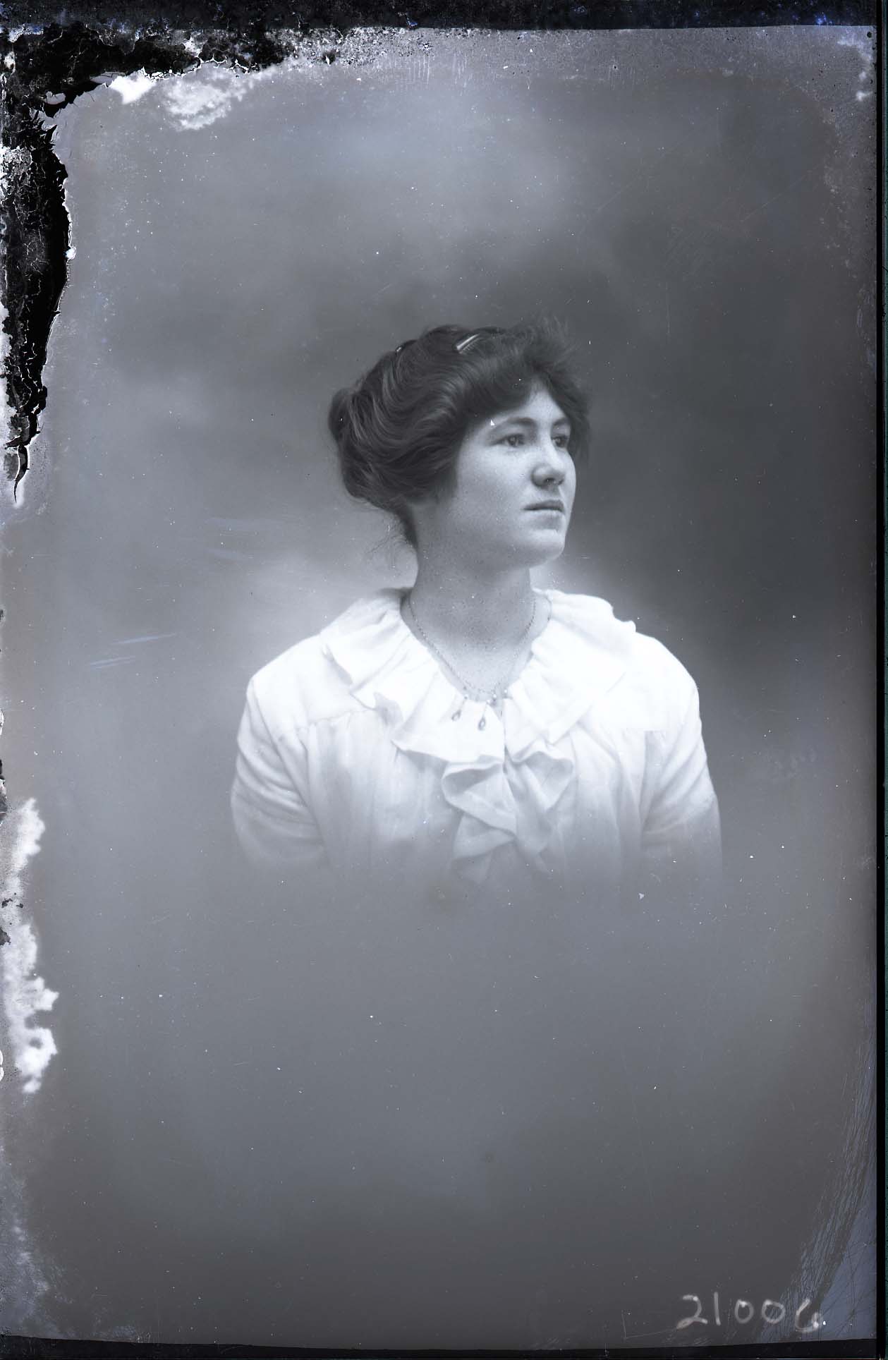 Portrait photograph of an unidentified woman wit her hair pulled back and wearing a ruffled collar on her dress.
