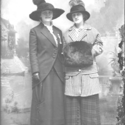 The woman on the left is wearing gloves and a ribbon pinned to her lapel. The woman on the right is wearing a striped jacket, plaid skirt and fur muff.