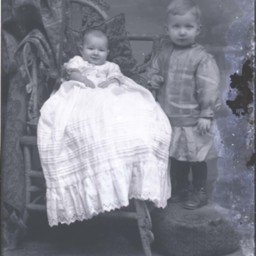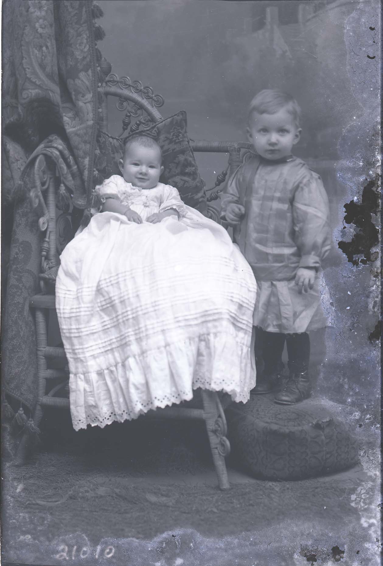 Two unidentified children, a baby in a long white gown and an older boy, are posed together.