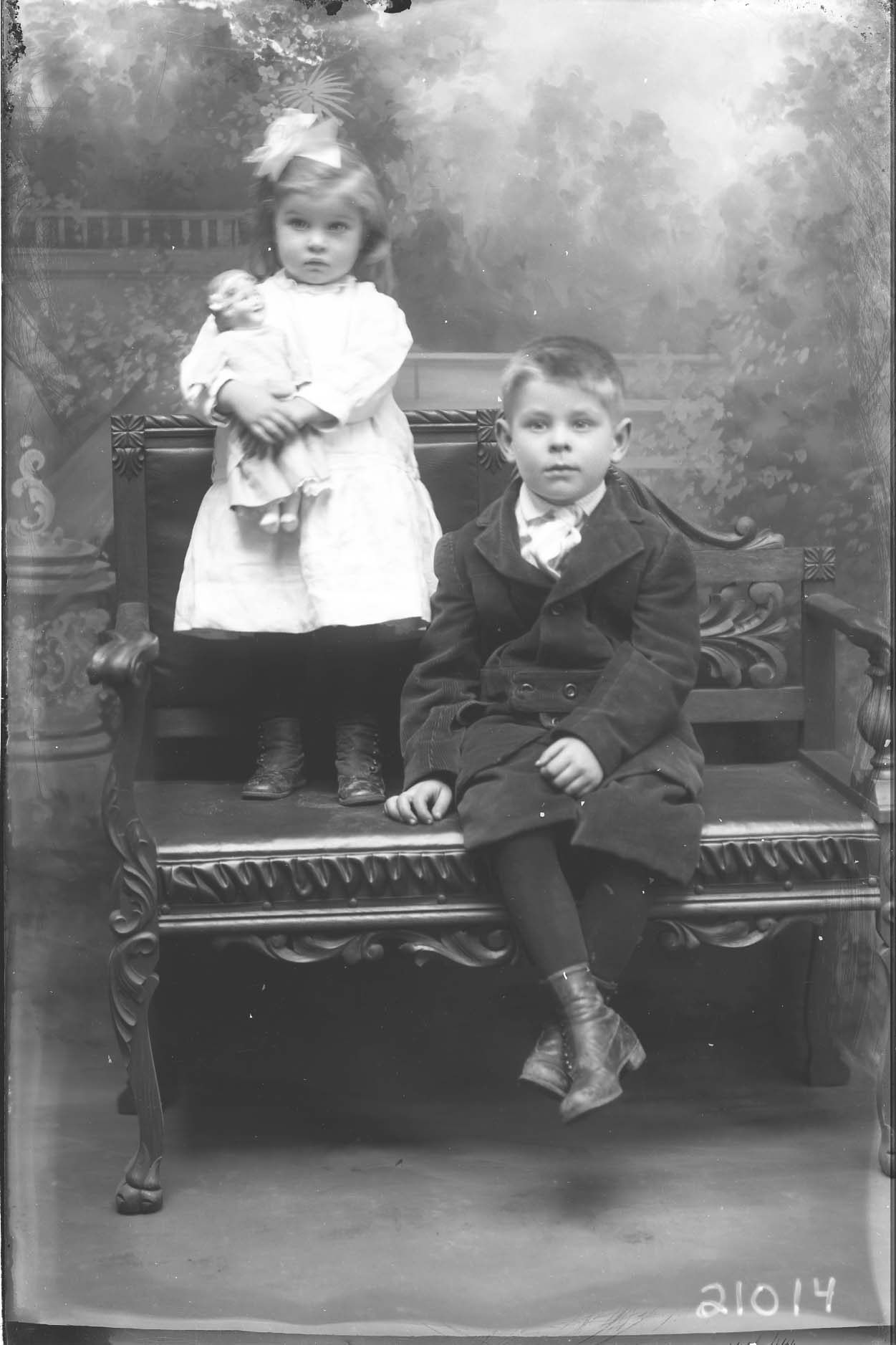A girl with a bow in her hair and holding a doll and standing on a bench. An older boy in short pants is seated beside her with his ankles crossed.