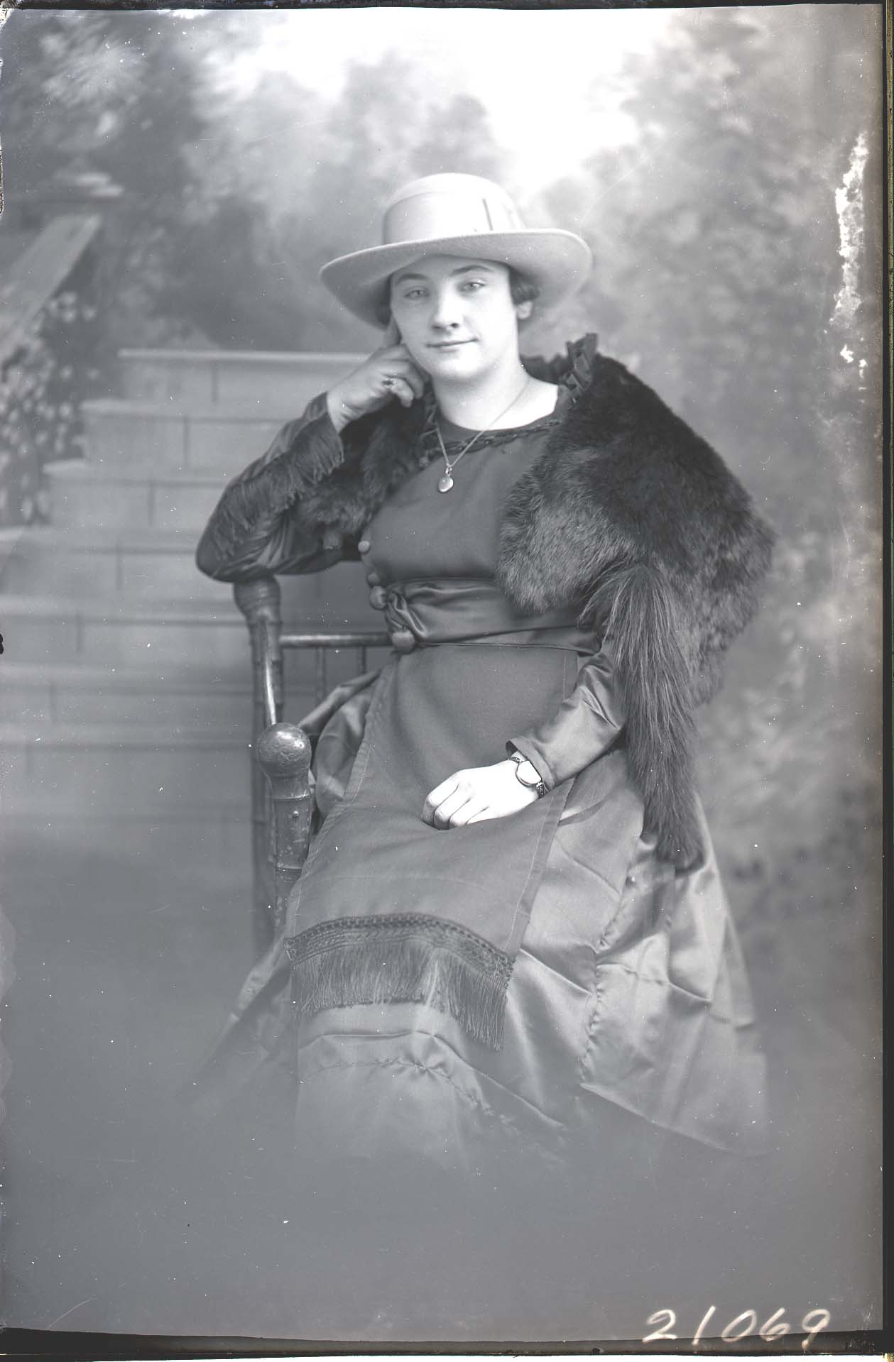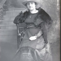Unidentified woman wearing a hat, fur stole and necklace with her dress, is seated on a chair.