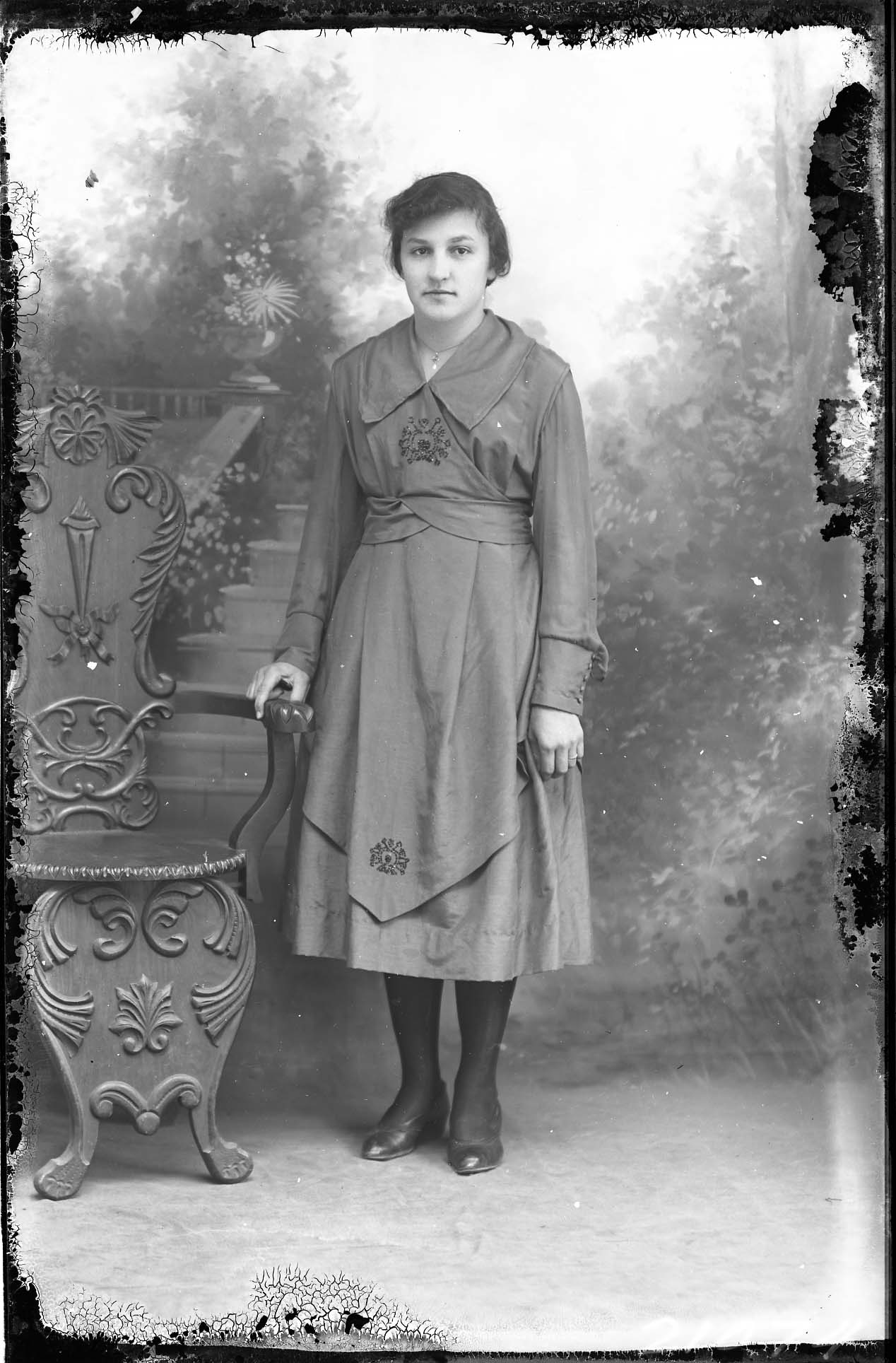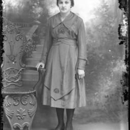 Unidentified woman standing by a chair and wearing a long-sleeved dress.