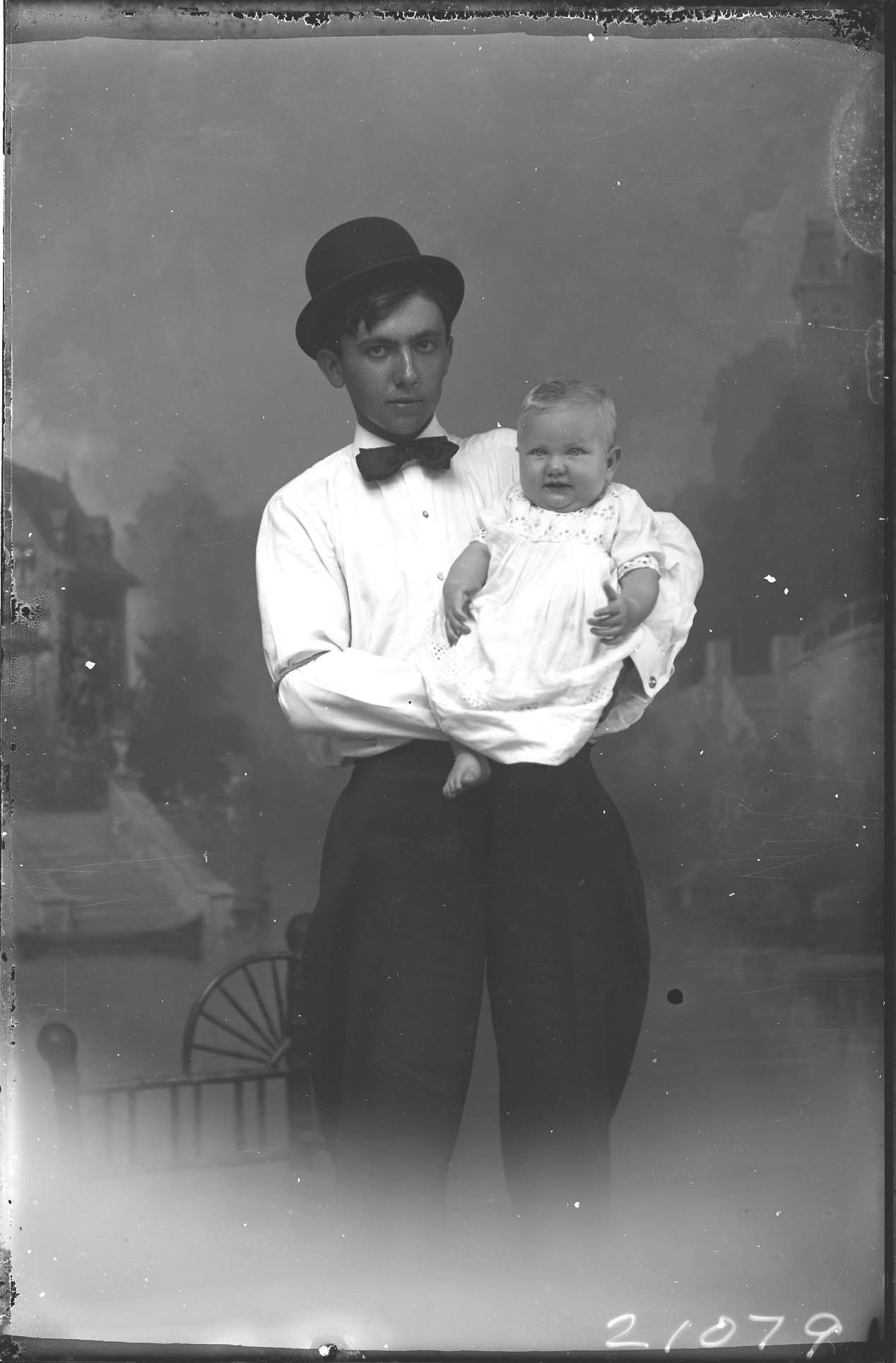 Unidentified man in a bow tie and wearing a hat is standing with an unidentified barefoot baby in his arms.