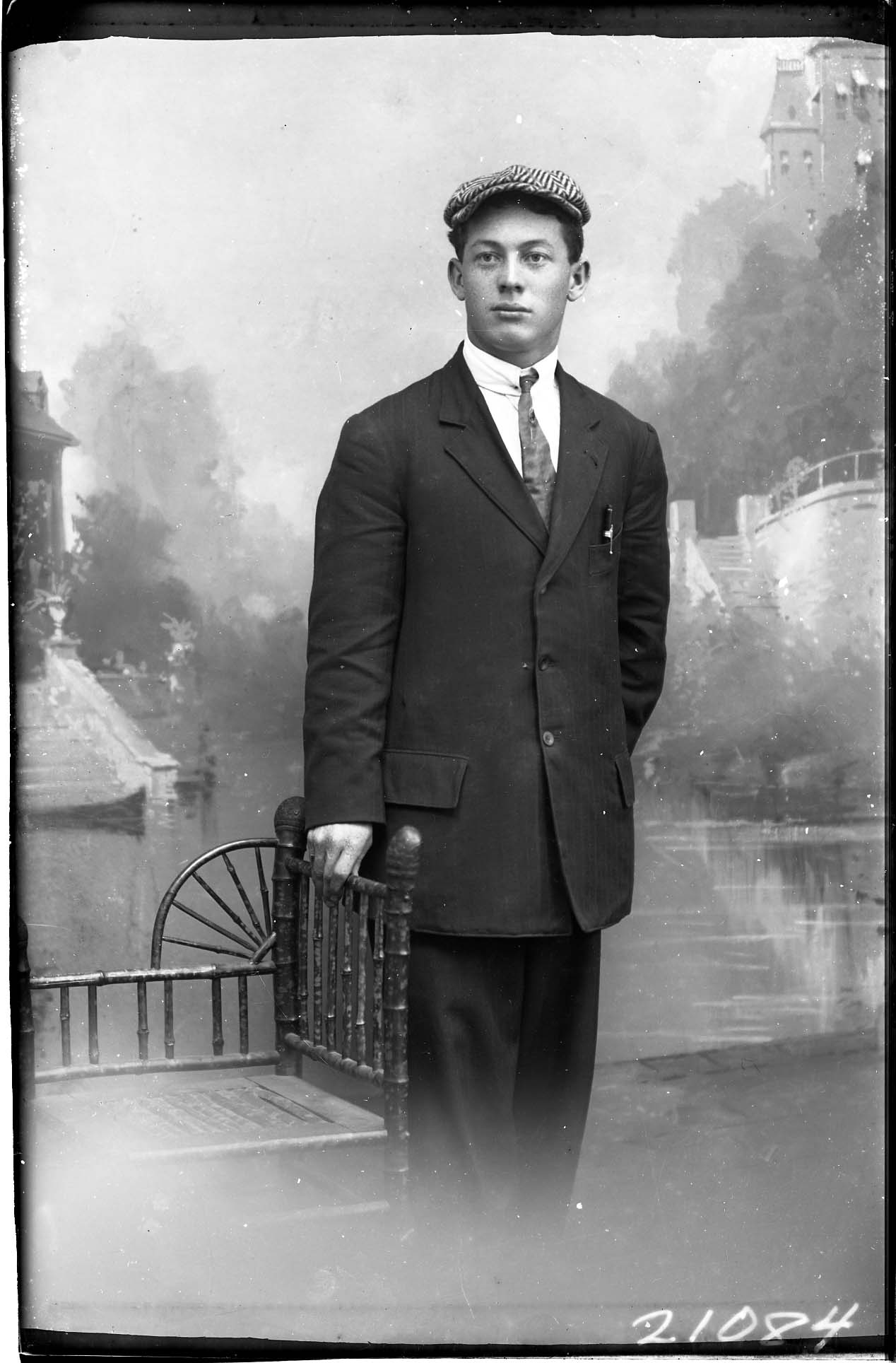 Unidentified man in a suit and tie is wearing a cap and standing by a chair. A pen is sticking out of his breast pocket.
