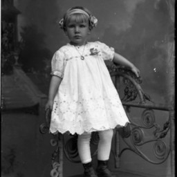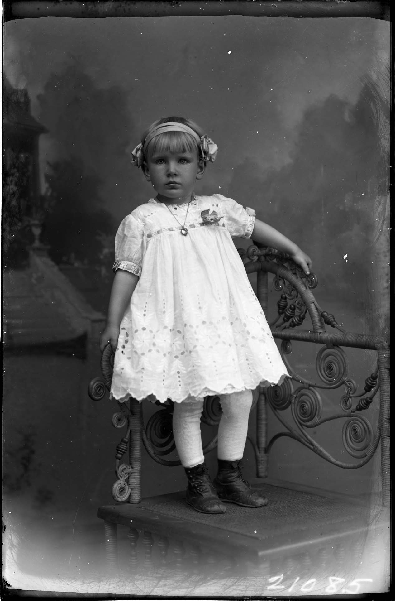 Unidentified girl with a headband decorated with two bows, one on either side of her head, is standing on a wicker chair. She has a necklace around her neck and a single flower pinned to her dress.