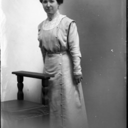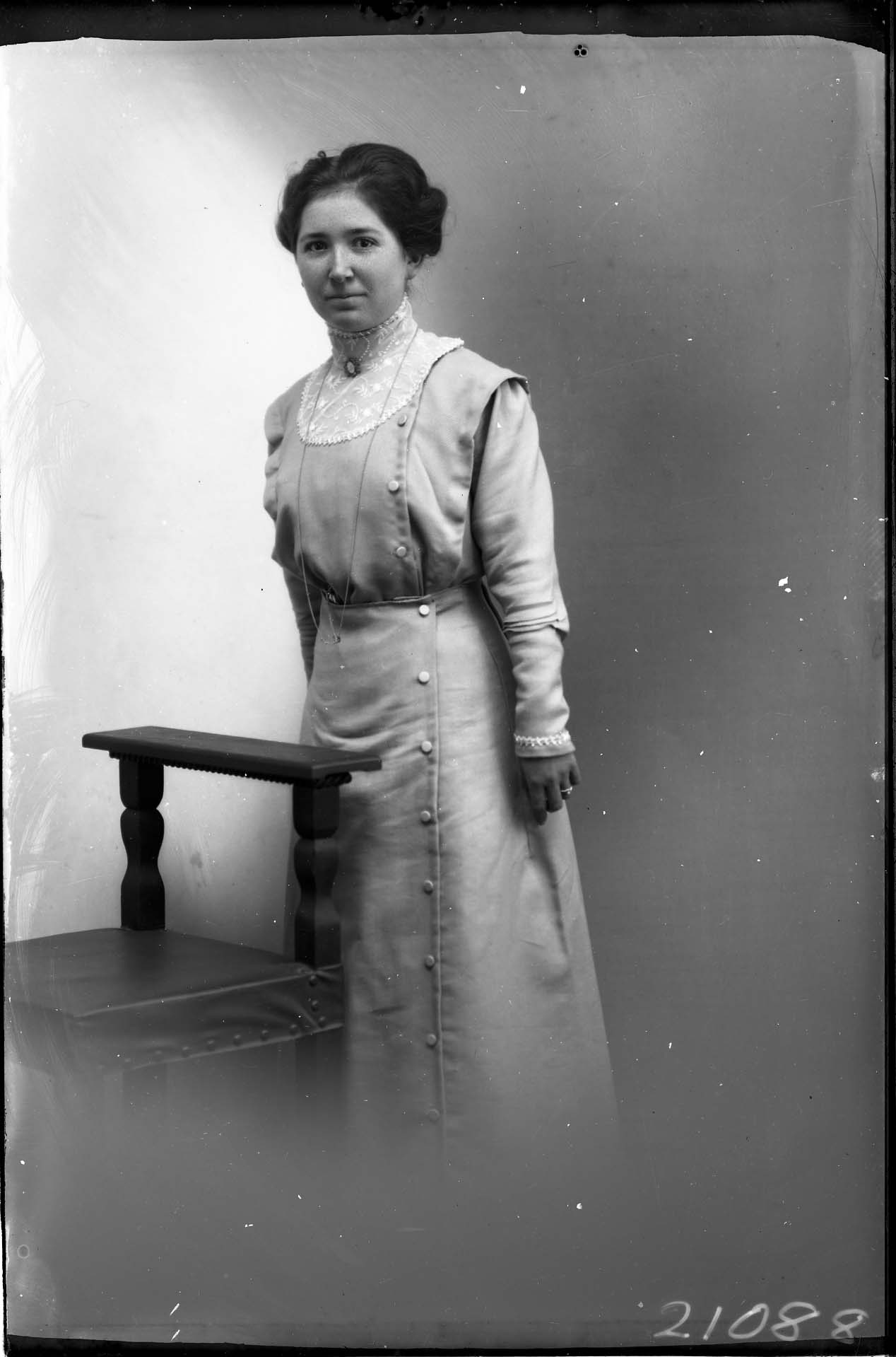 Unidentified woman is with her hair styled back is wearing a brooch at the neck of her long-sleeved dress and standing by a chair.