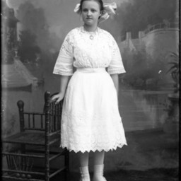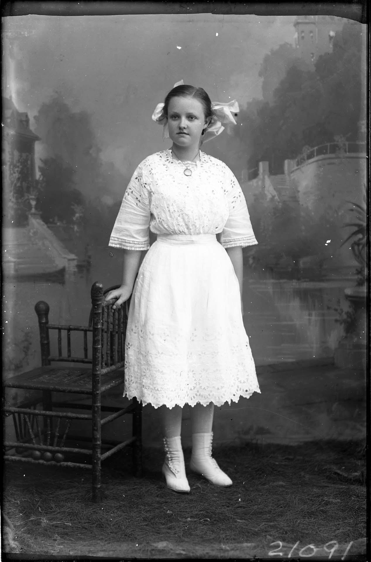 Unidentified young woman with a large bow in her hair is wearing a locket around her neck and a dress with a scalloped hemline. She is posed standing by a chair.