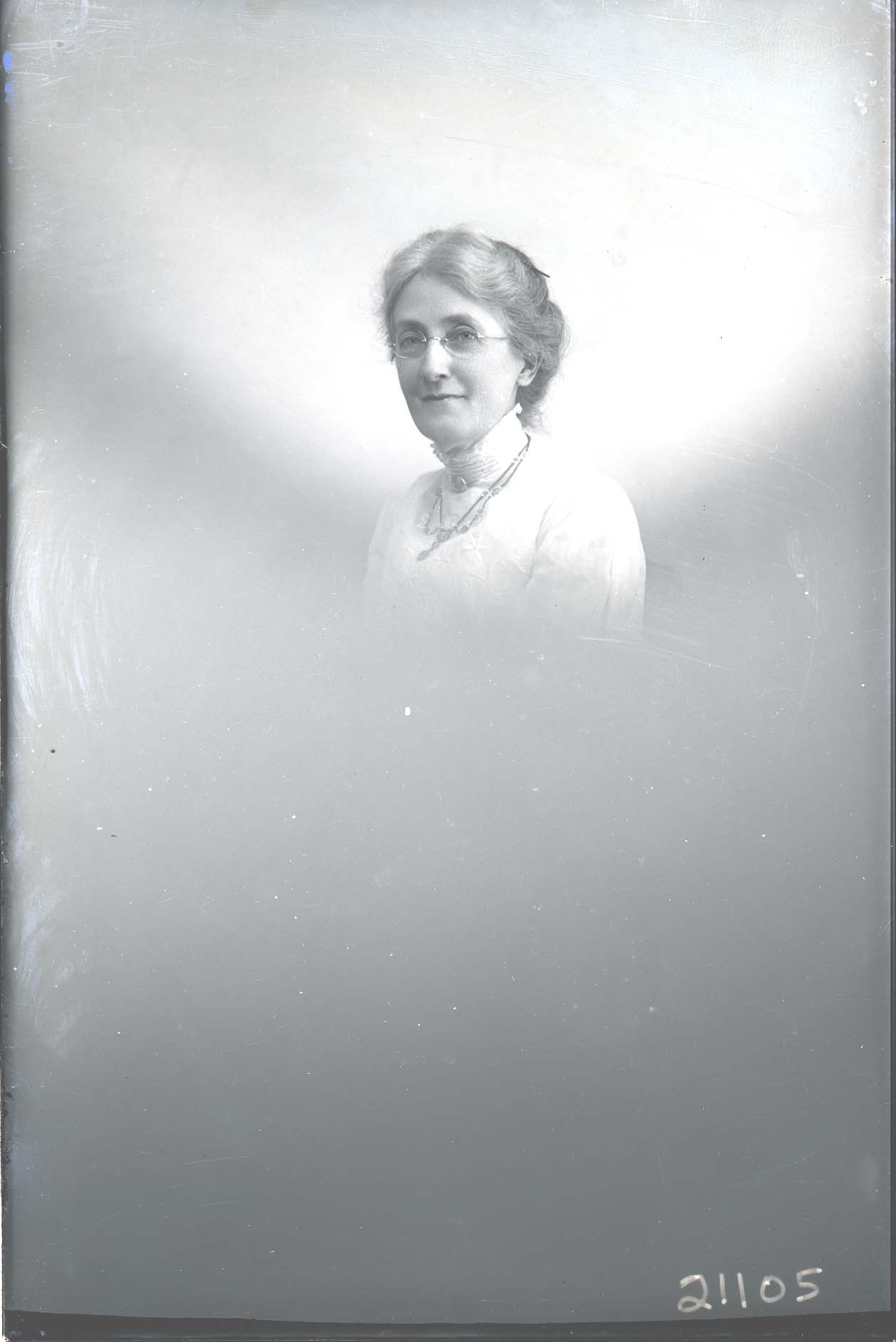 Portrait photograph of an unidentified woman with her hair pulled back and wearing a pin on her high collar.