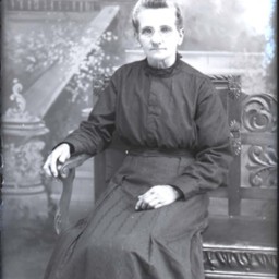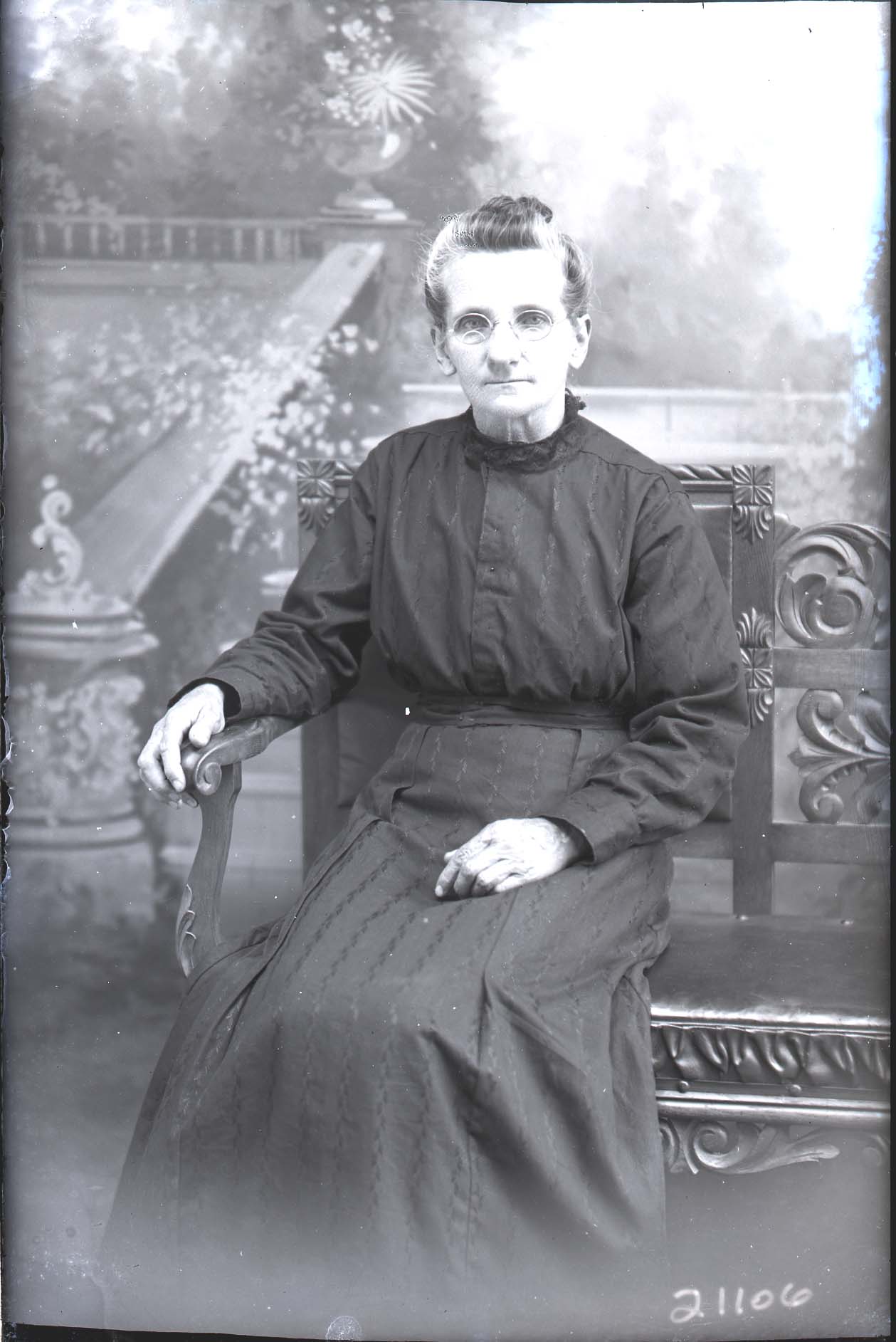 Unidentified older woman with glasses and her hair pulled back is seated on a bench and wearing a long-sleeved dress.