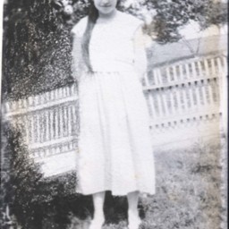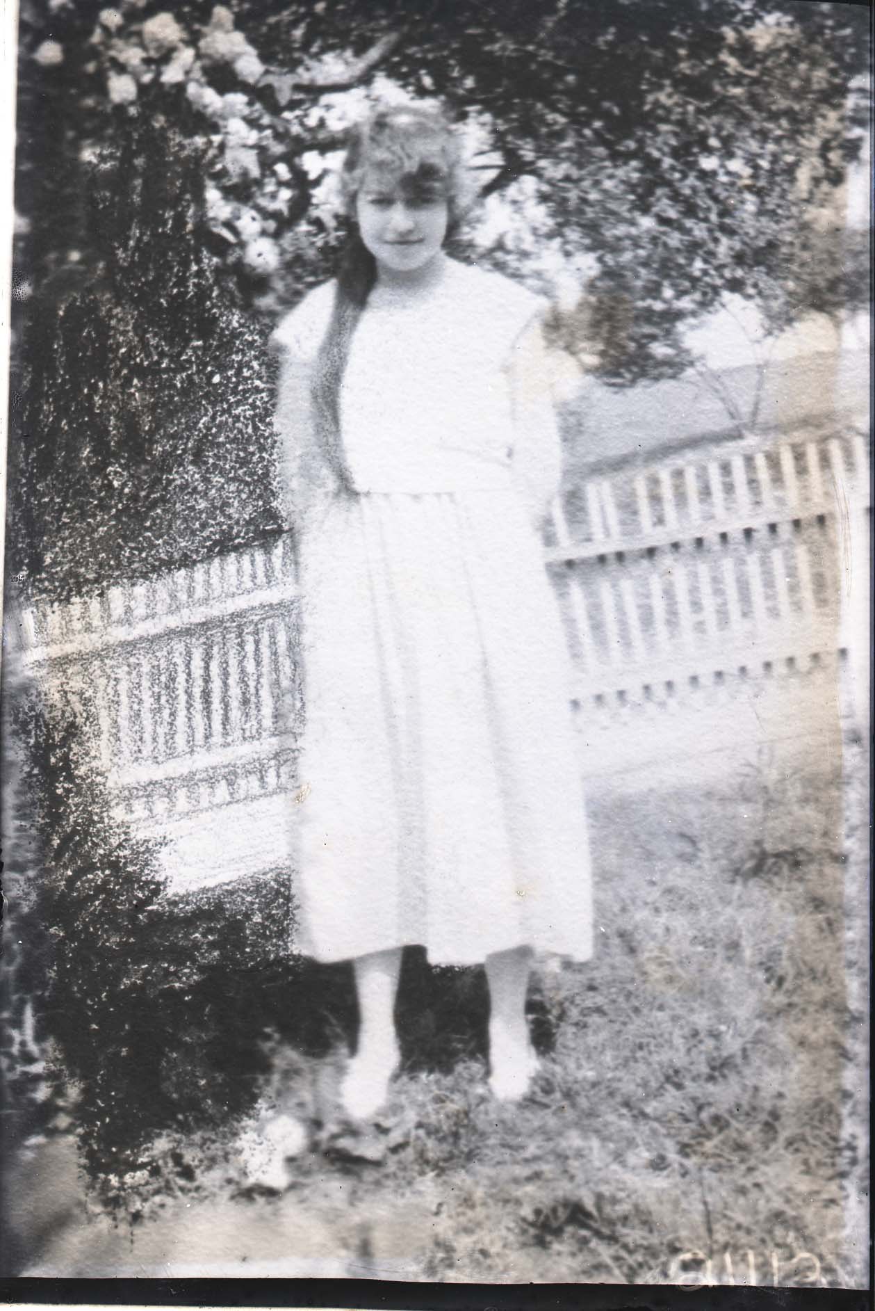 Unidentified young woman with a long ponytail is standing in front of a picket fence outdoors with her hands behind her back.