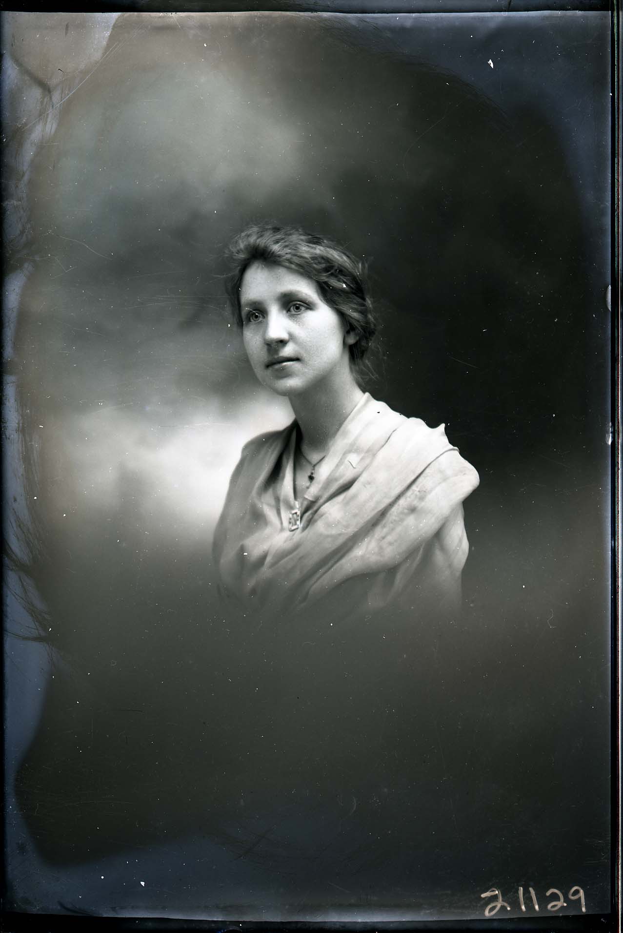Portrait photograph of an unidentified young woman with her hair pulled back and wearing a necklace and pin with her dress.