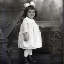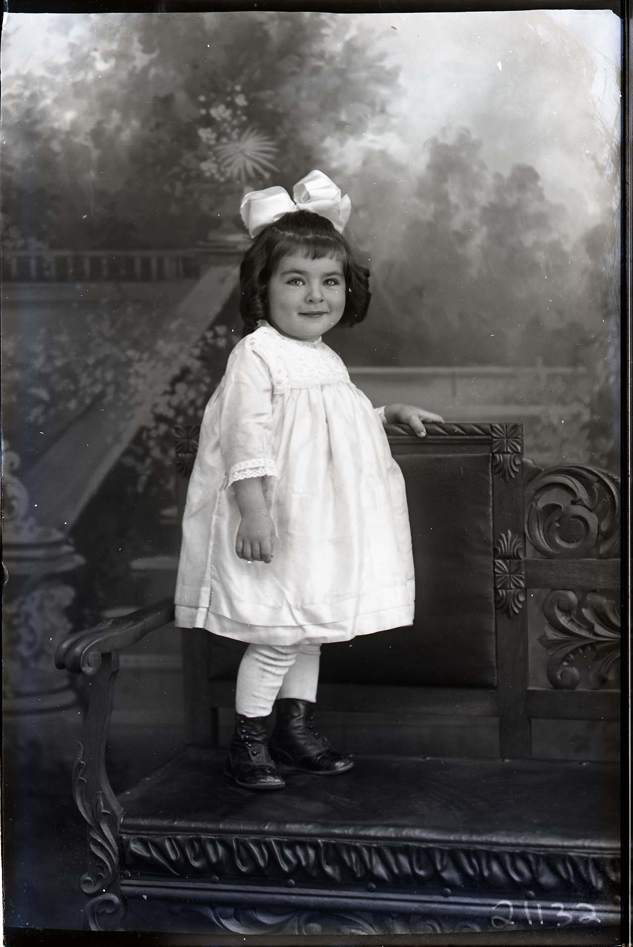 Unidentified little girl with a bow in her short curled hair with bangs, is standing on a bench and smiling.