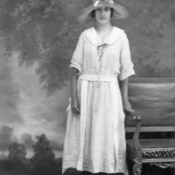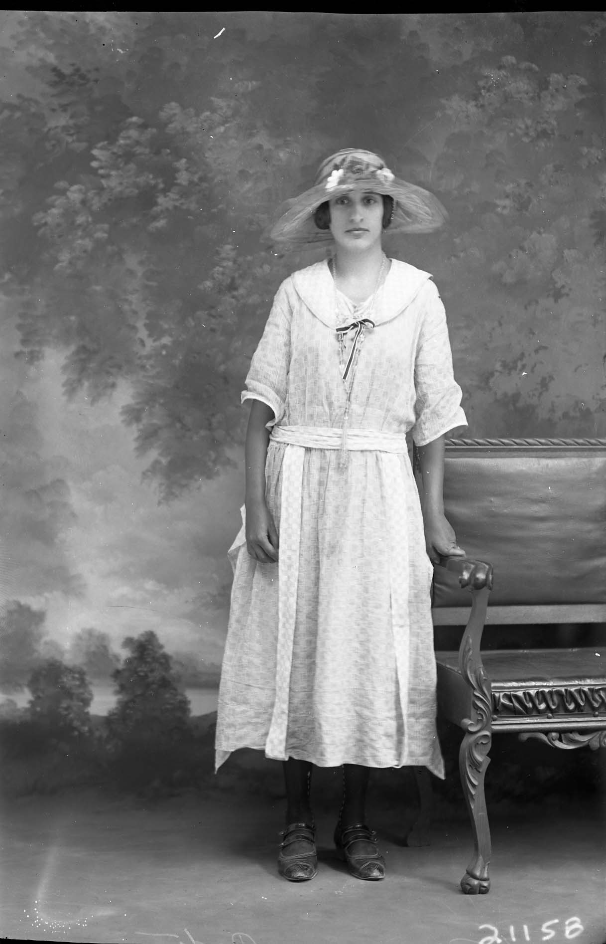 Unidentified woman wearing a wide-brimmed hat and standing by a bench.