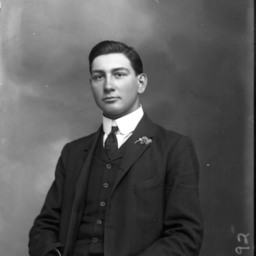 Portrait photograph of an unidentified man wearing a suit and tie with a starched collar and a boutonniere pinned to his lapel.