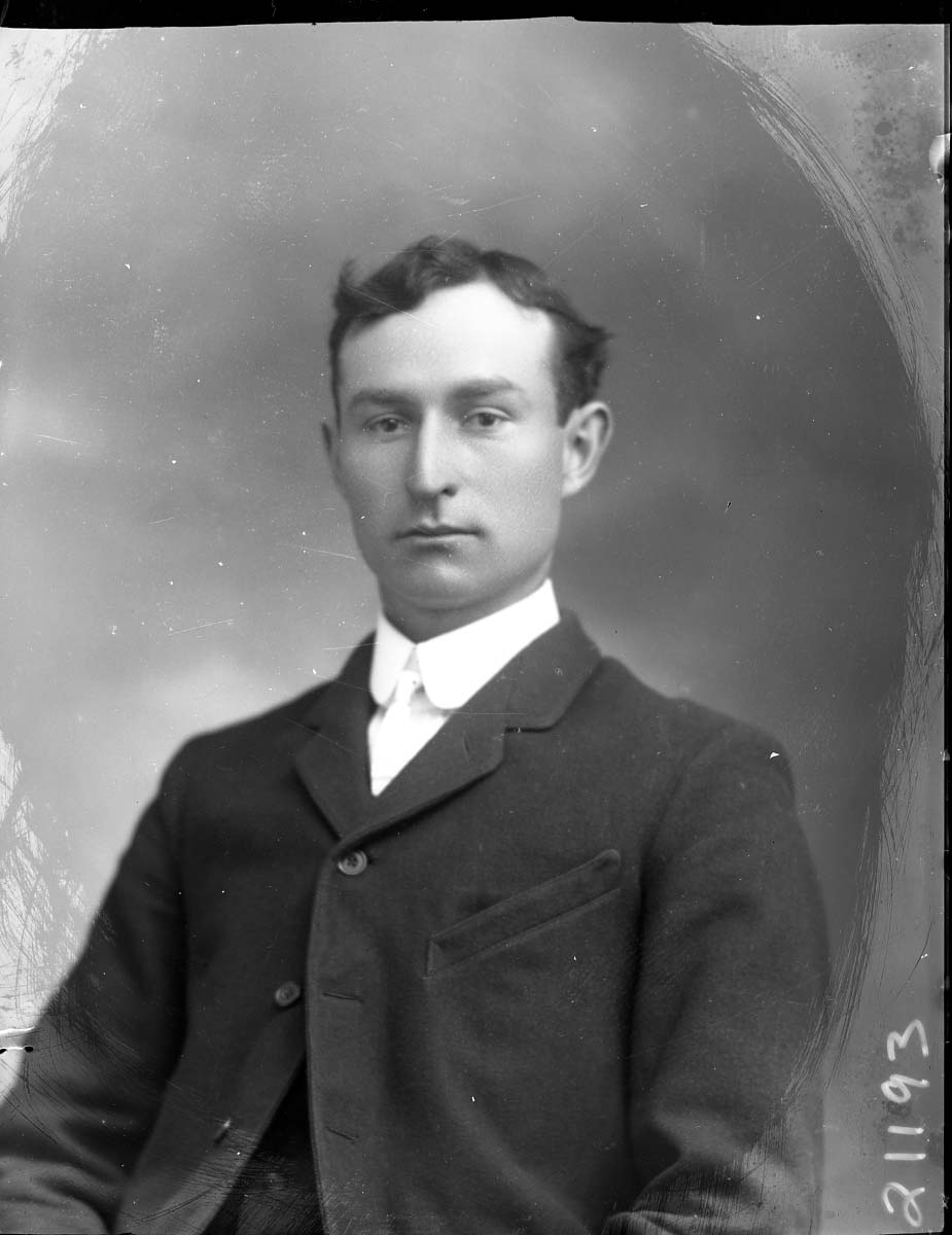 Portrait photograph of an unidentified man wearing a suit and tie with a starched collar.
