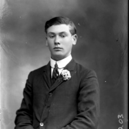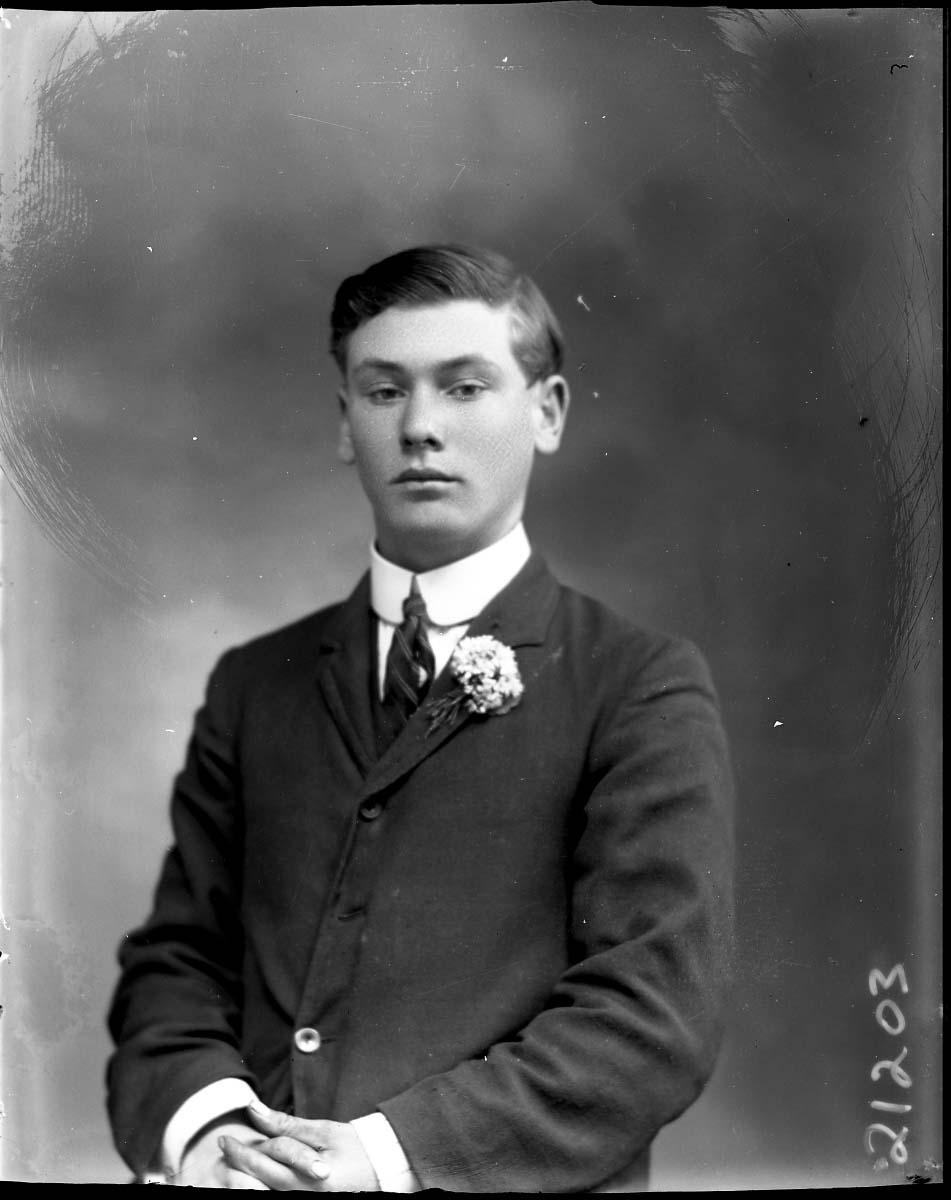 Portrait photograph of an unidentified young man wearing a suit and striped tie with a starched collar and a boutonniere on his lapel.