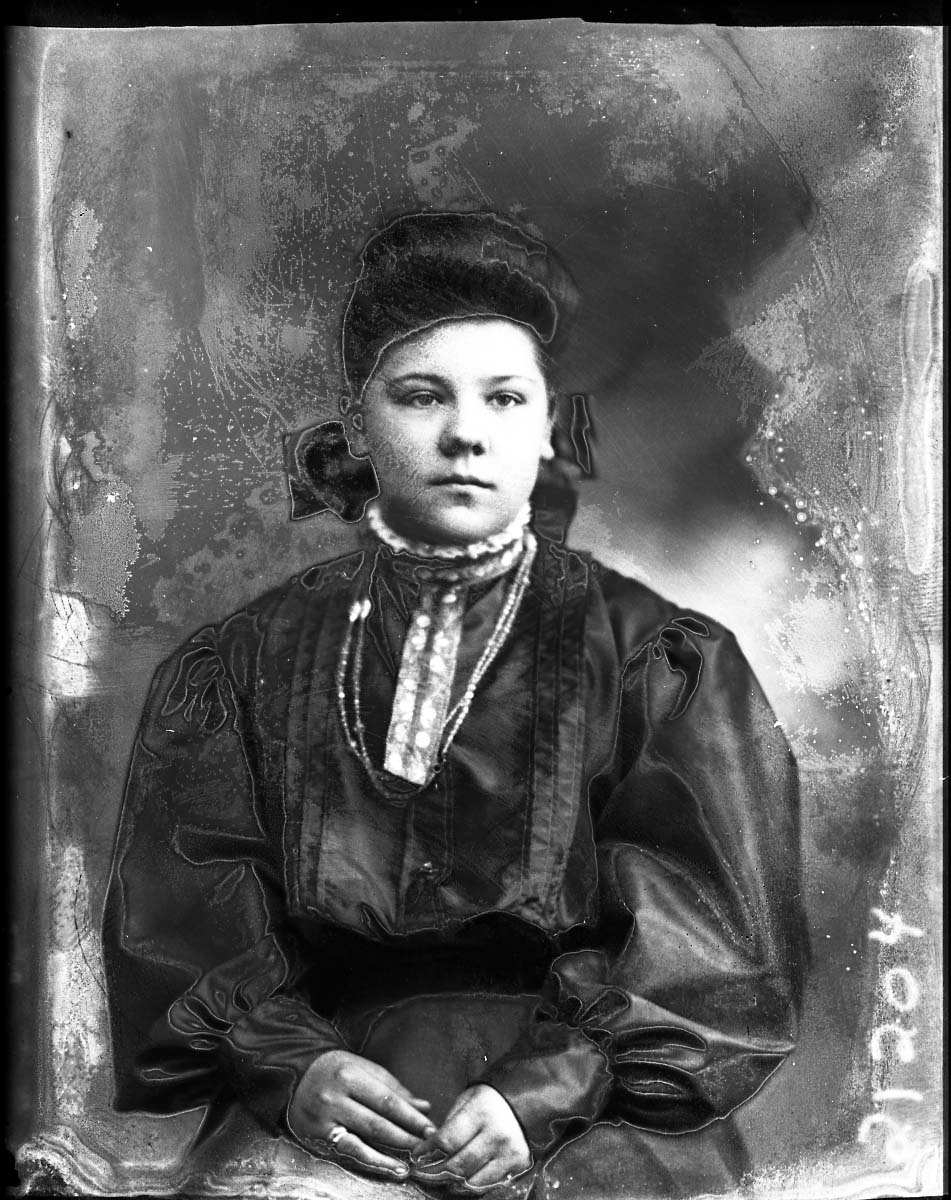 Damaged portrait photograph of an unidentified young woman with a bow in her hair and wearing a necklace with her high-necked collar.