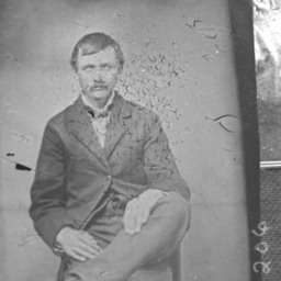 Photo of an earlier photograph of an unidentified man seated with one leg over the other.