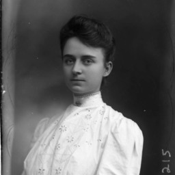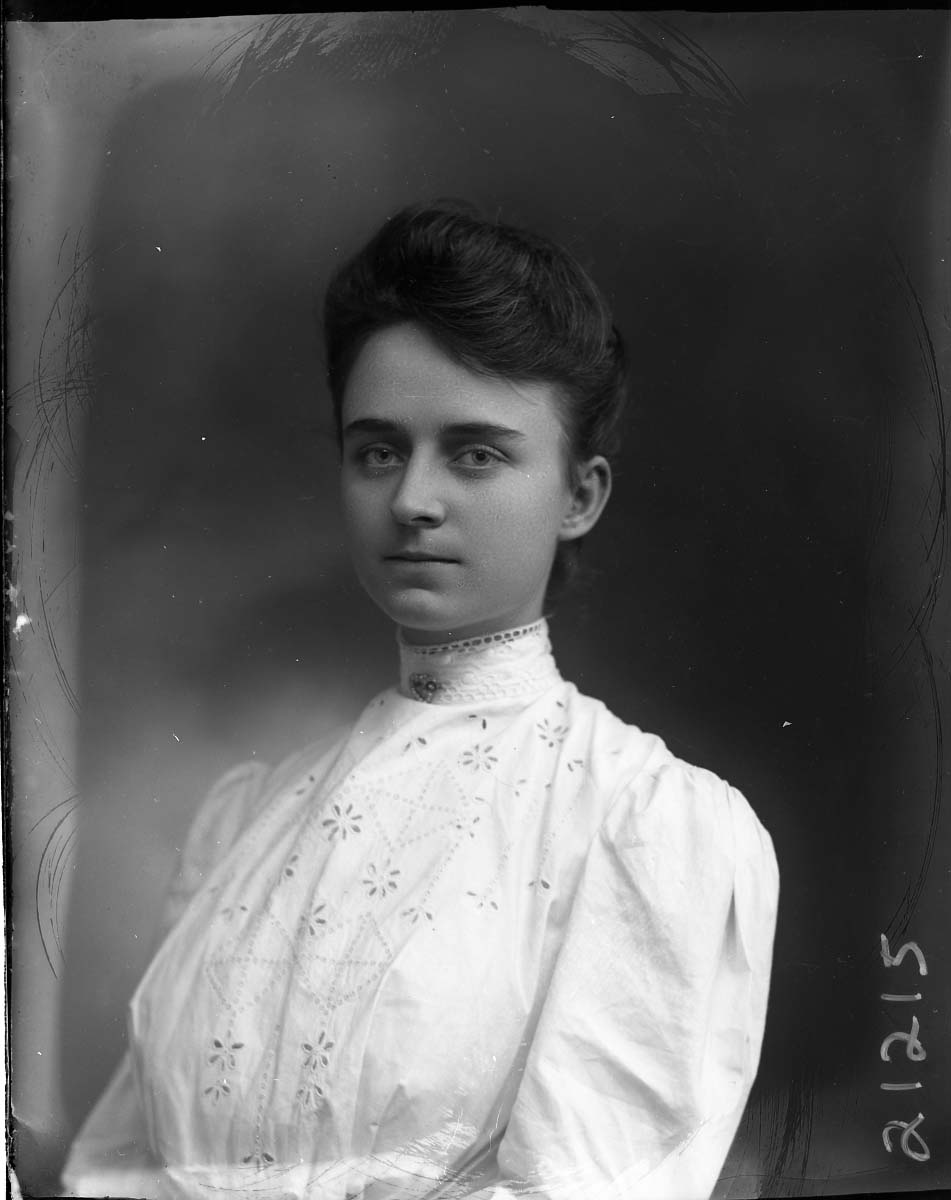 Portrait photograph of an unidentified young woman with her hair styled up and wearing a pin at her neck.
