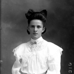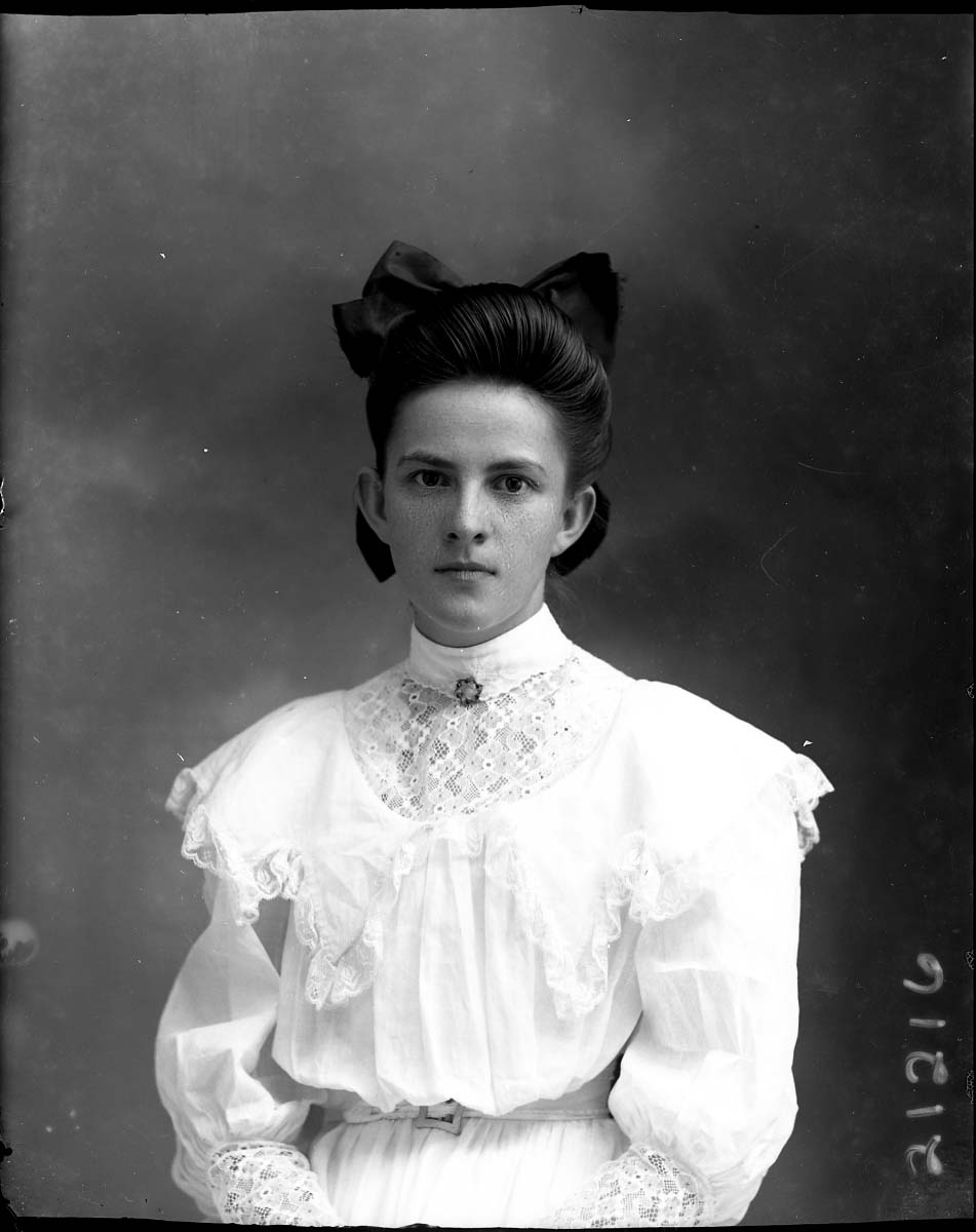 Portrait photograph of an unidentified young woman wearing a bow in her styled hair and a pin at the neck of her dress.