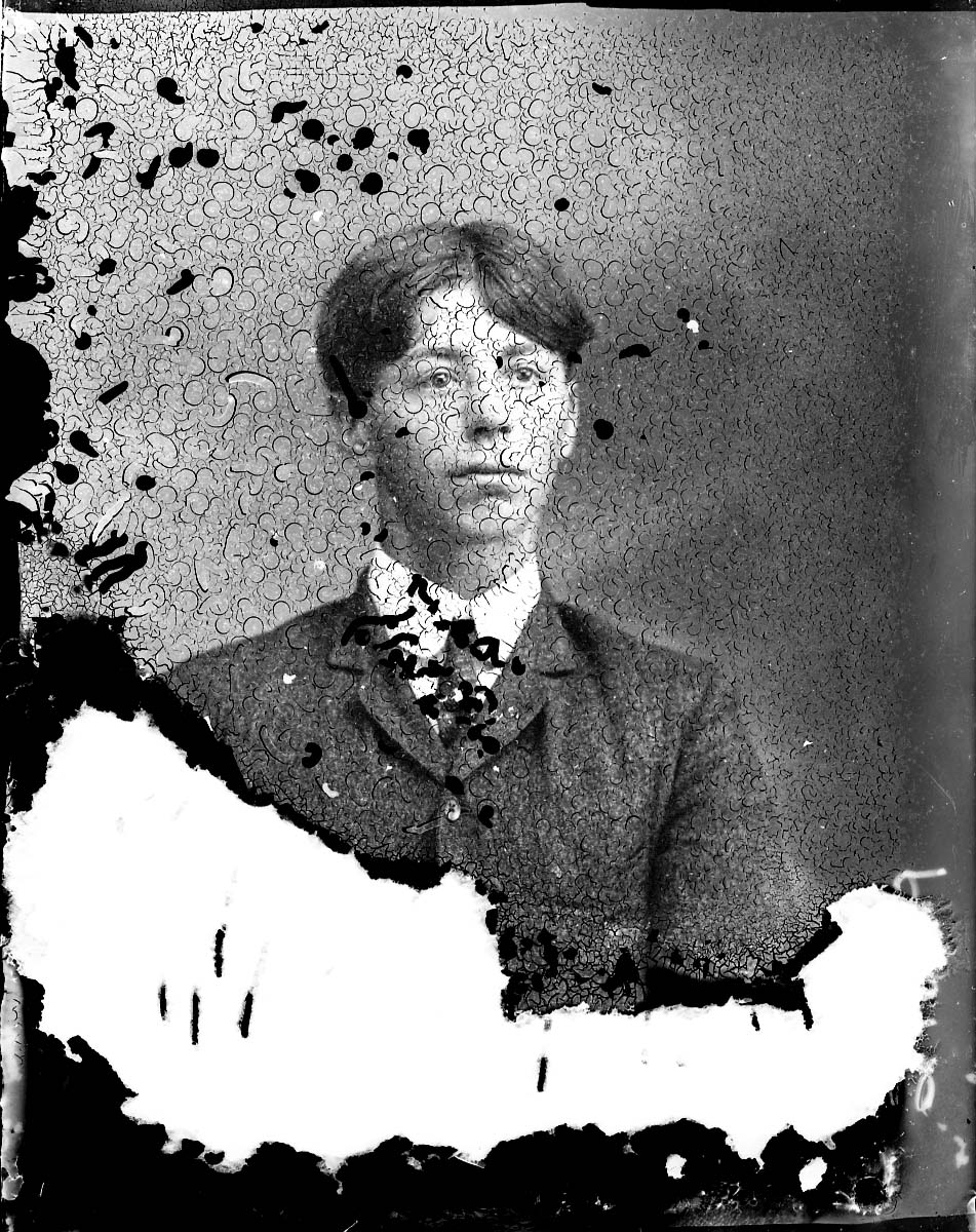 Significant emulsion damage is visible and obscures the lower part of the image.