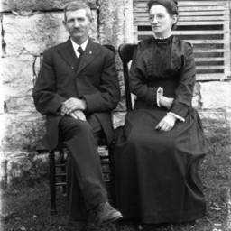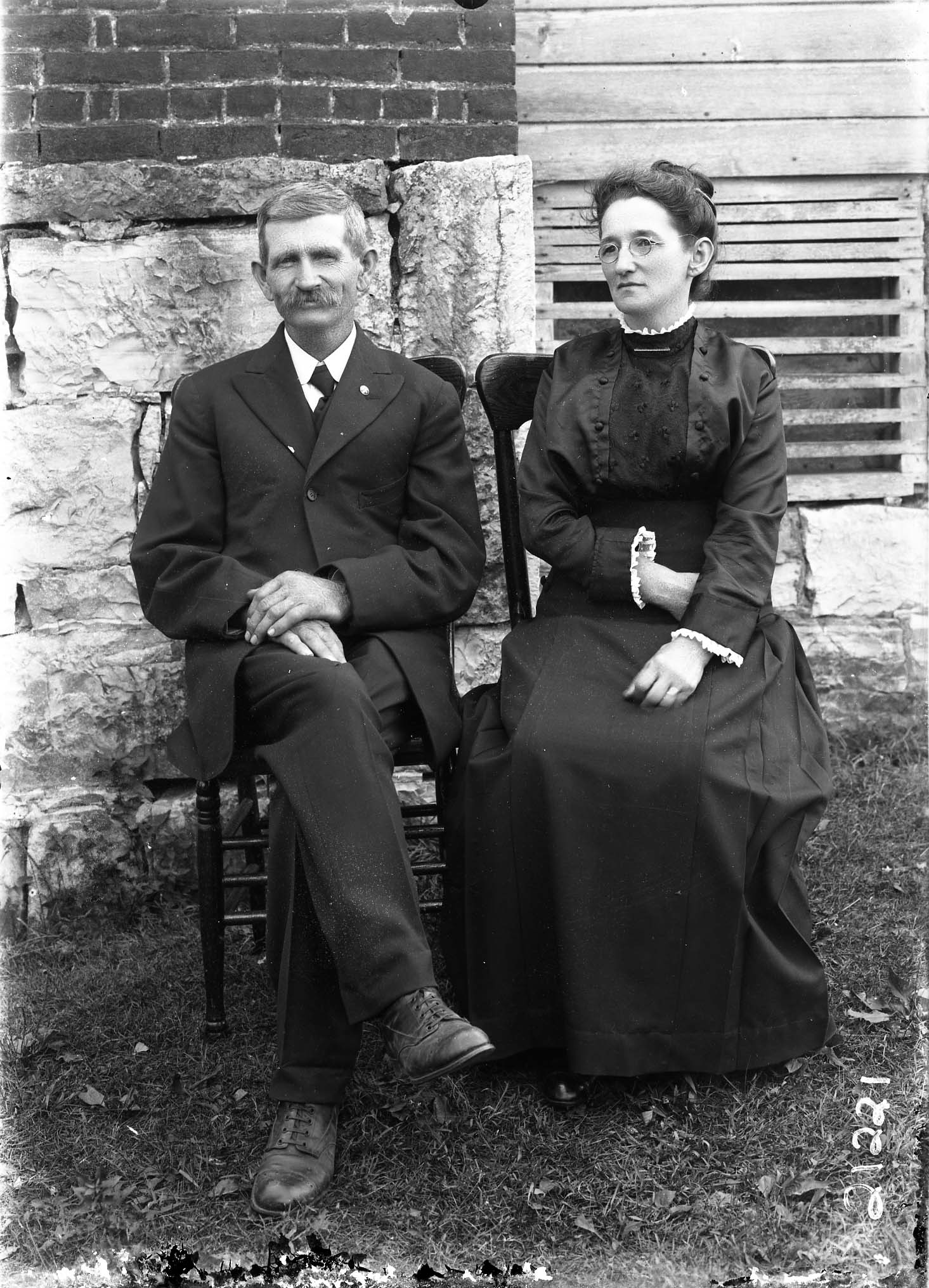 Unidentified man with a mustache and wearing a suit and tie, is seated outdoors with his legs crossed and his hands in his lap. Beside him, is seated an unidentified woman with her hair up and wearing a long dress.