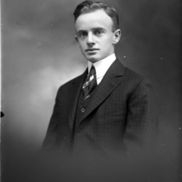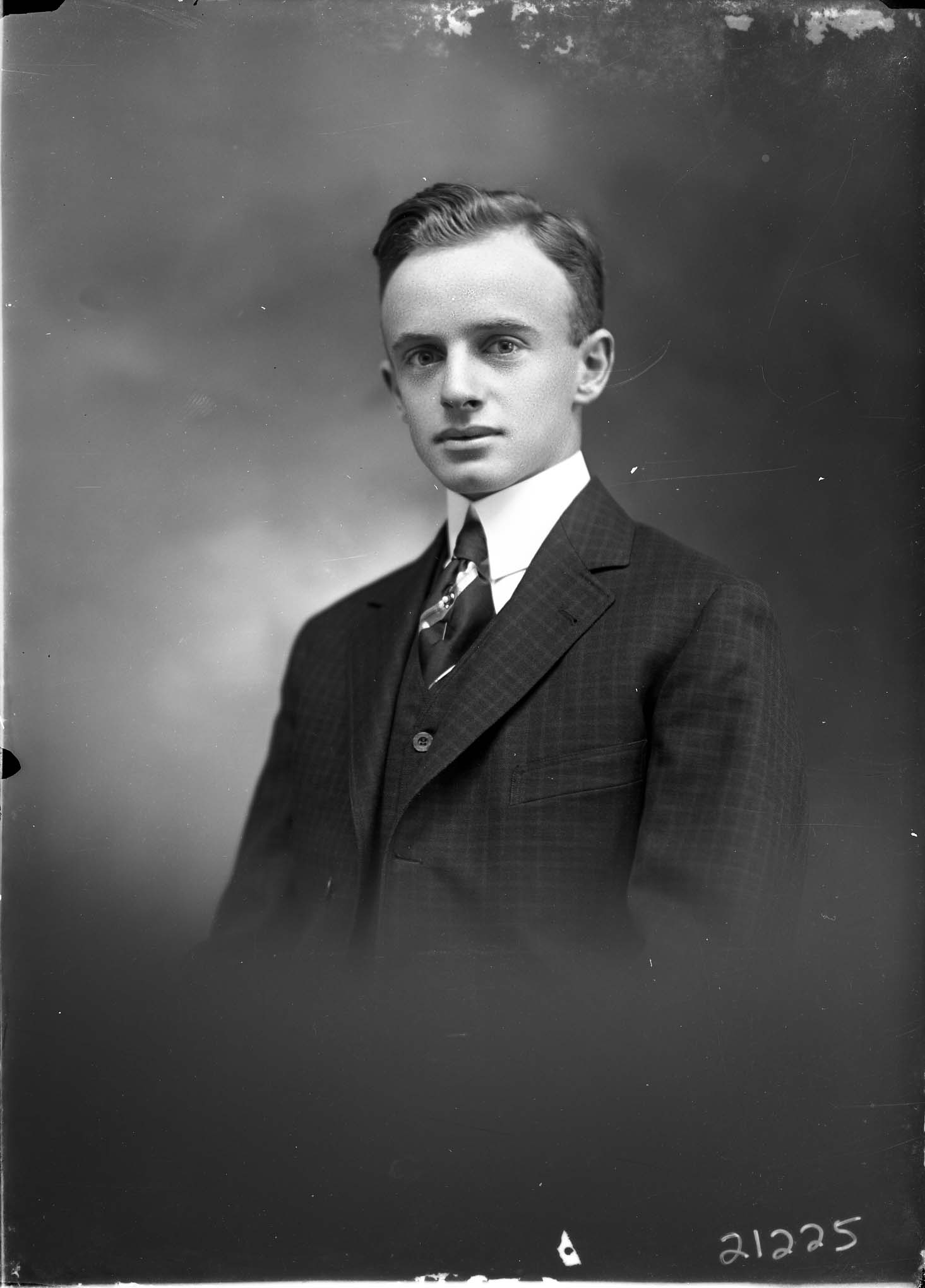 Portrait photograph of an unidentified young man wearing a suit and tie with a starched collar.