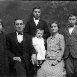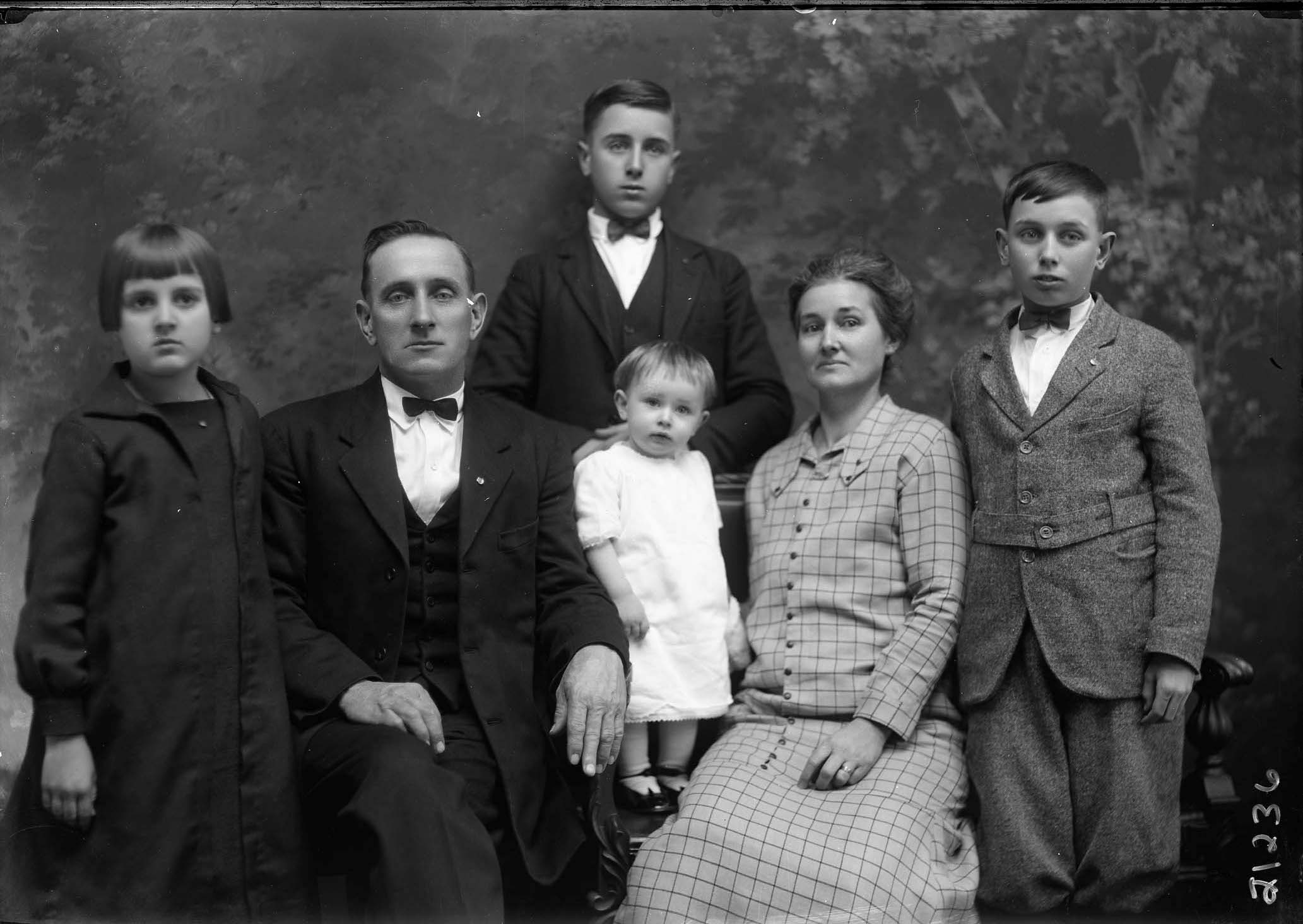 Unidentified man in a bow tie and woman are seated with four unidentified children of varying ages posed around them. There are two boys, a girl and a toddler.