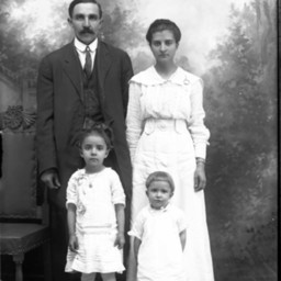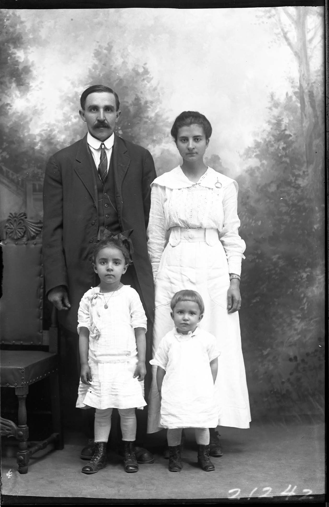 Unidentified man with a mustache and woman are standing together with two young unidentified children, a girl and a toddler.