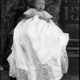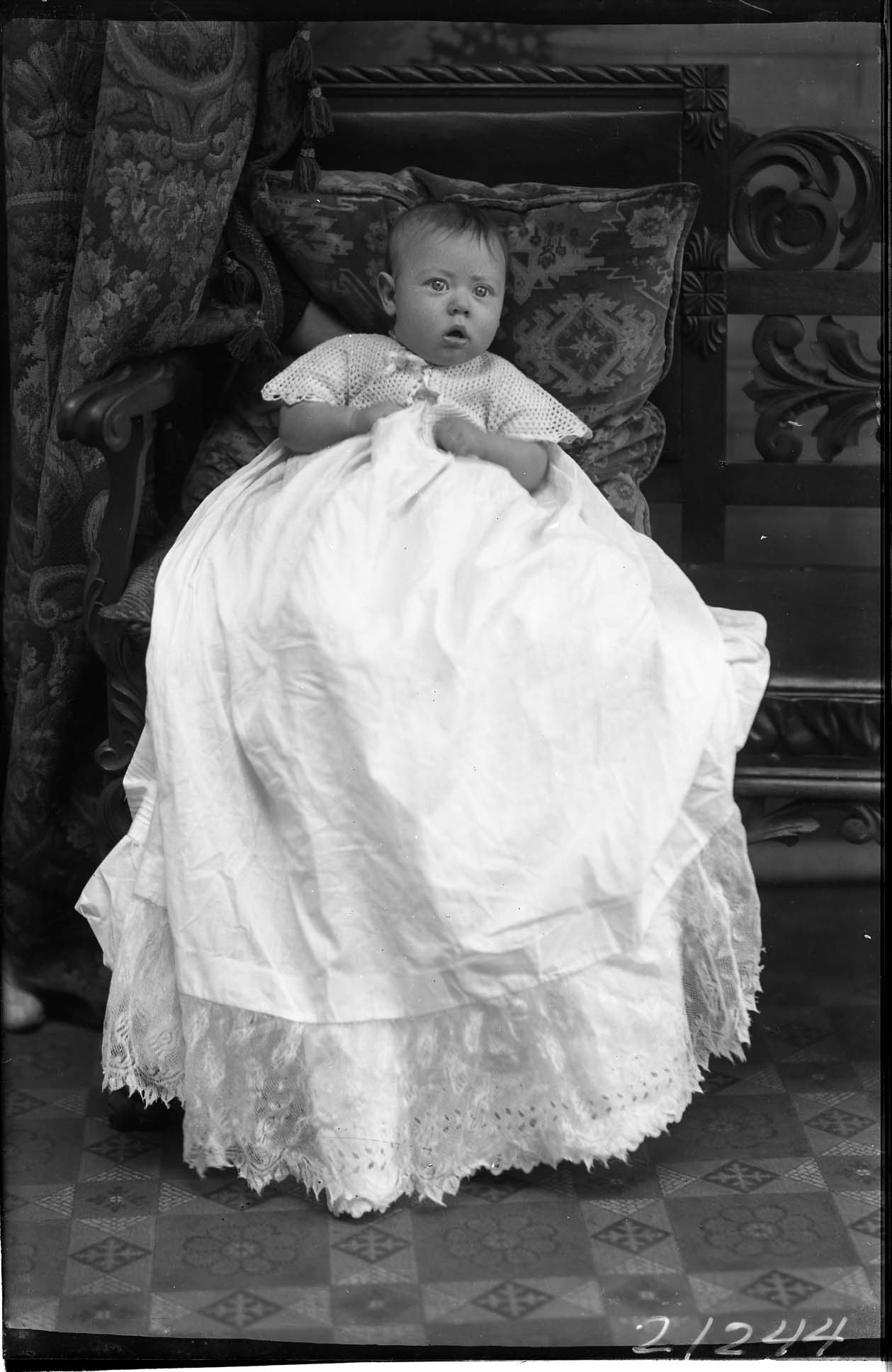 Unidentified baby in a long white dress is seated against a large pillow on a bench.