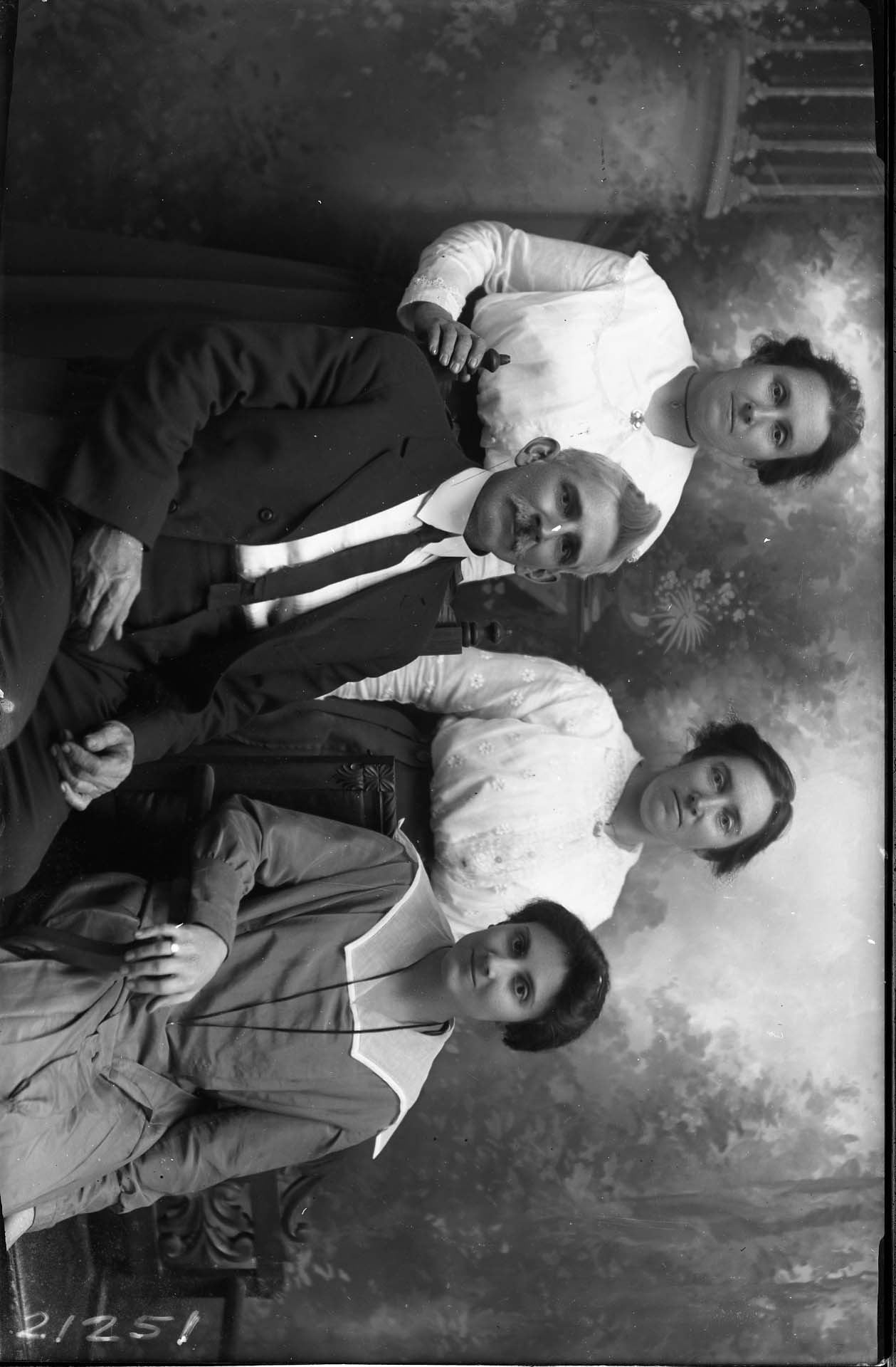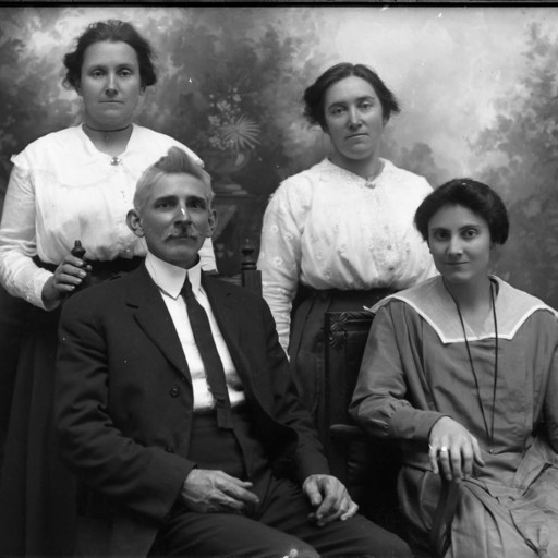 Four unidentified people, three women and a man with a mustache, are posed together.