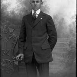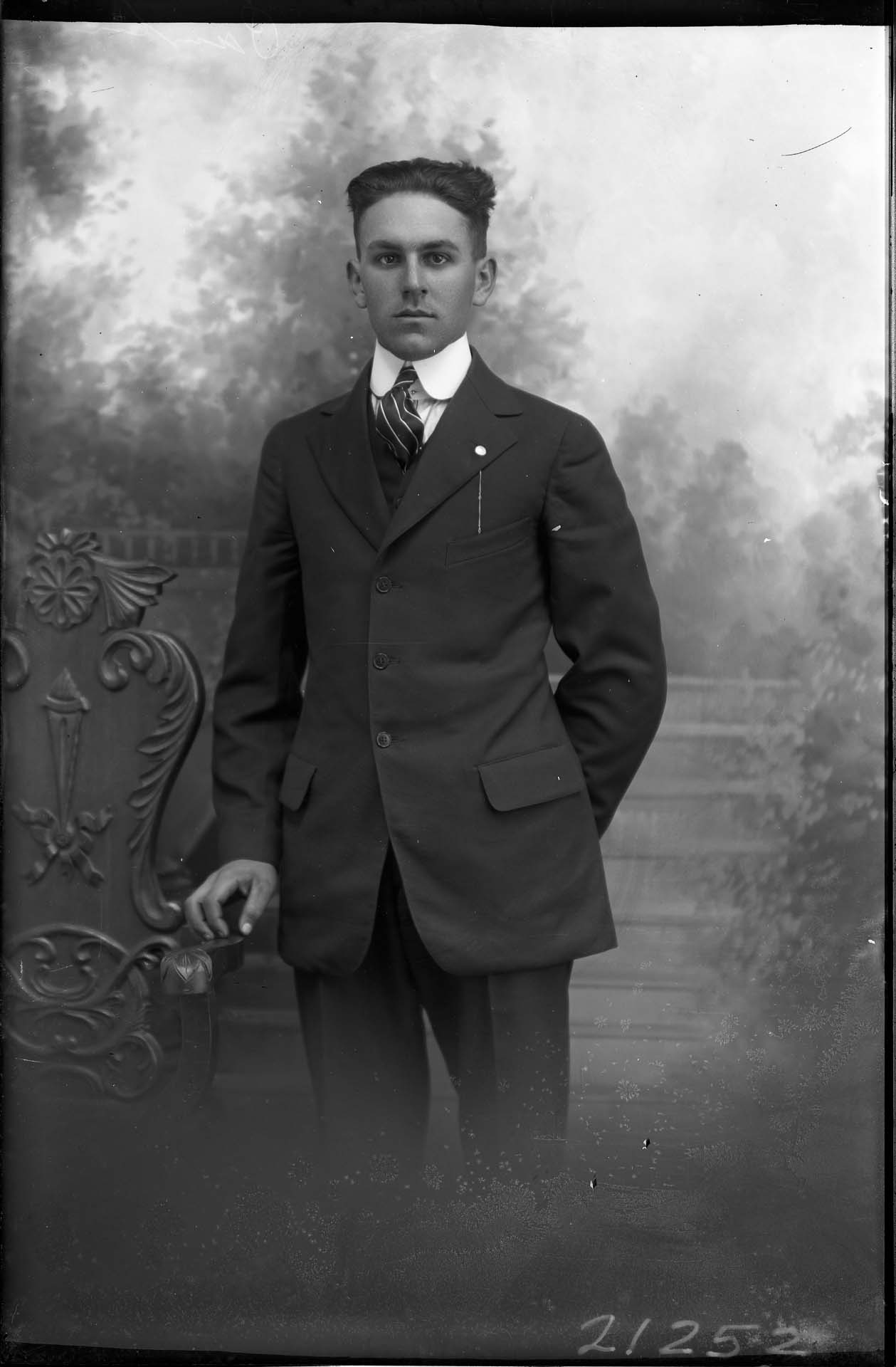 Unidentified young man wearing a suit and striped tie with a starched collar, is standing with one hand behind his back.