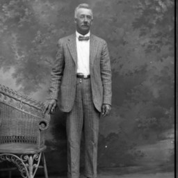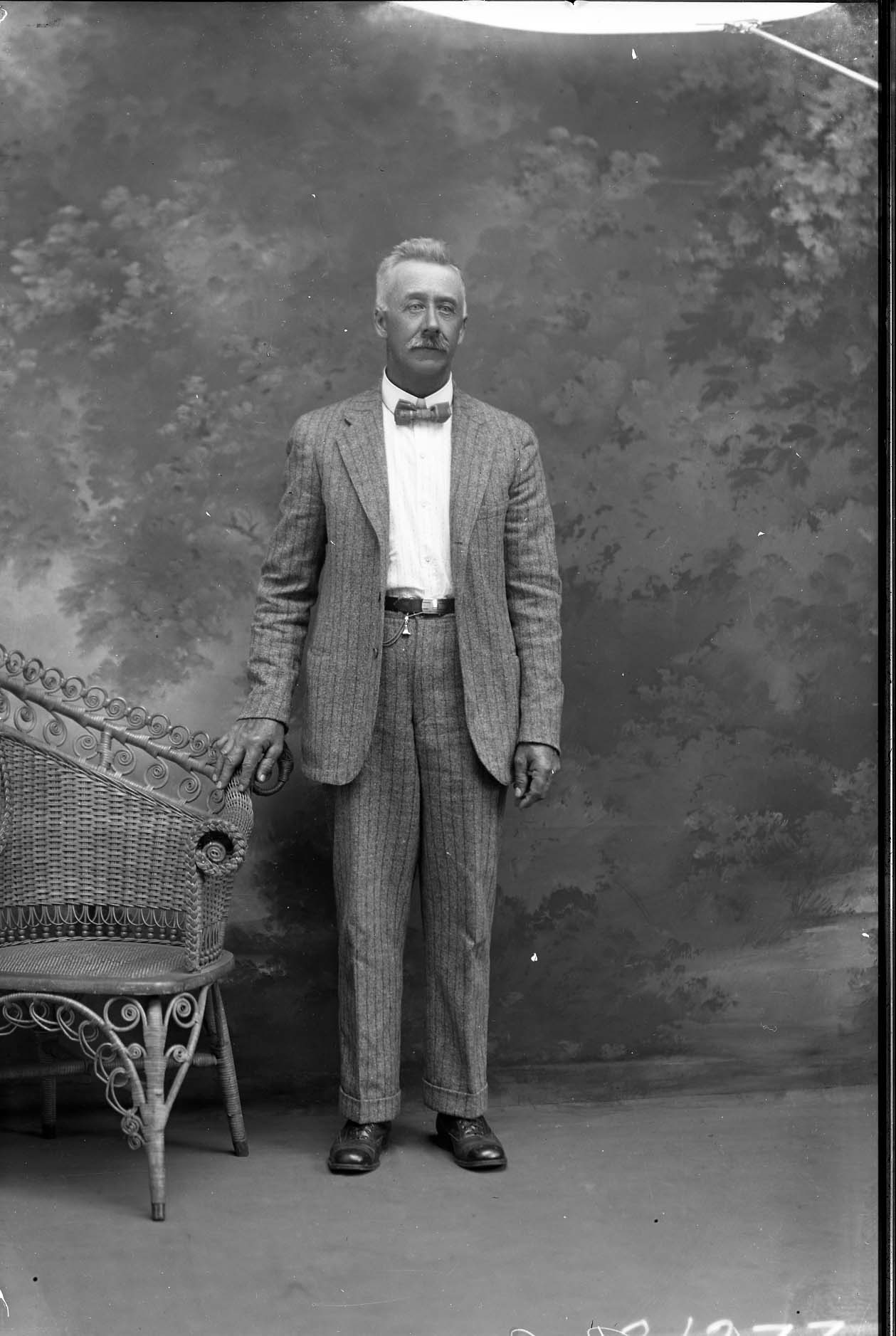 Unidentified man with a mustache is wearing a striped suit and bow tie and standing by a wicker chair.