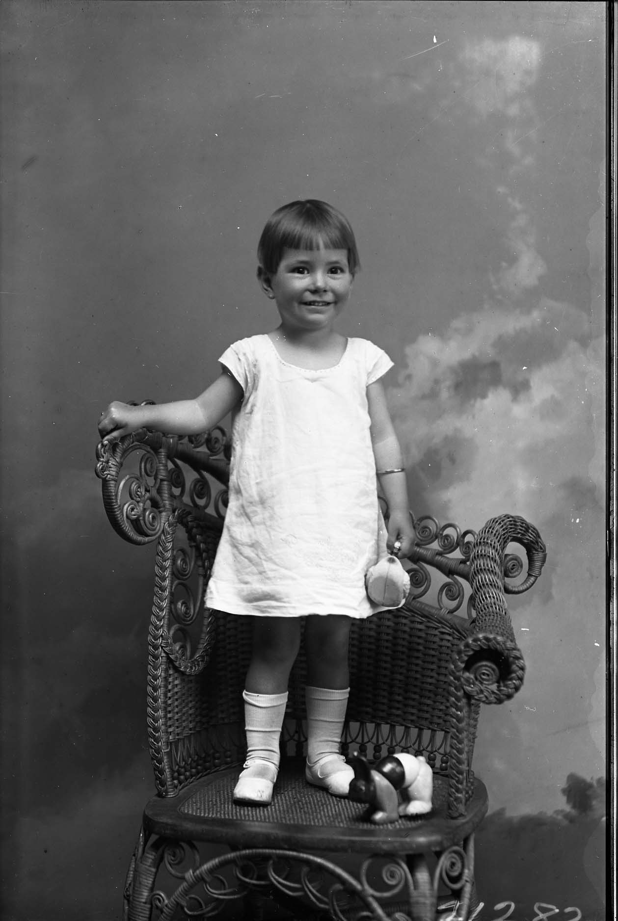 Unidentified girl with short hair and bangs is standing on a wicker chair with toys.