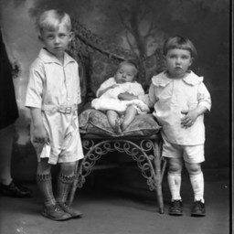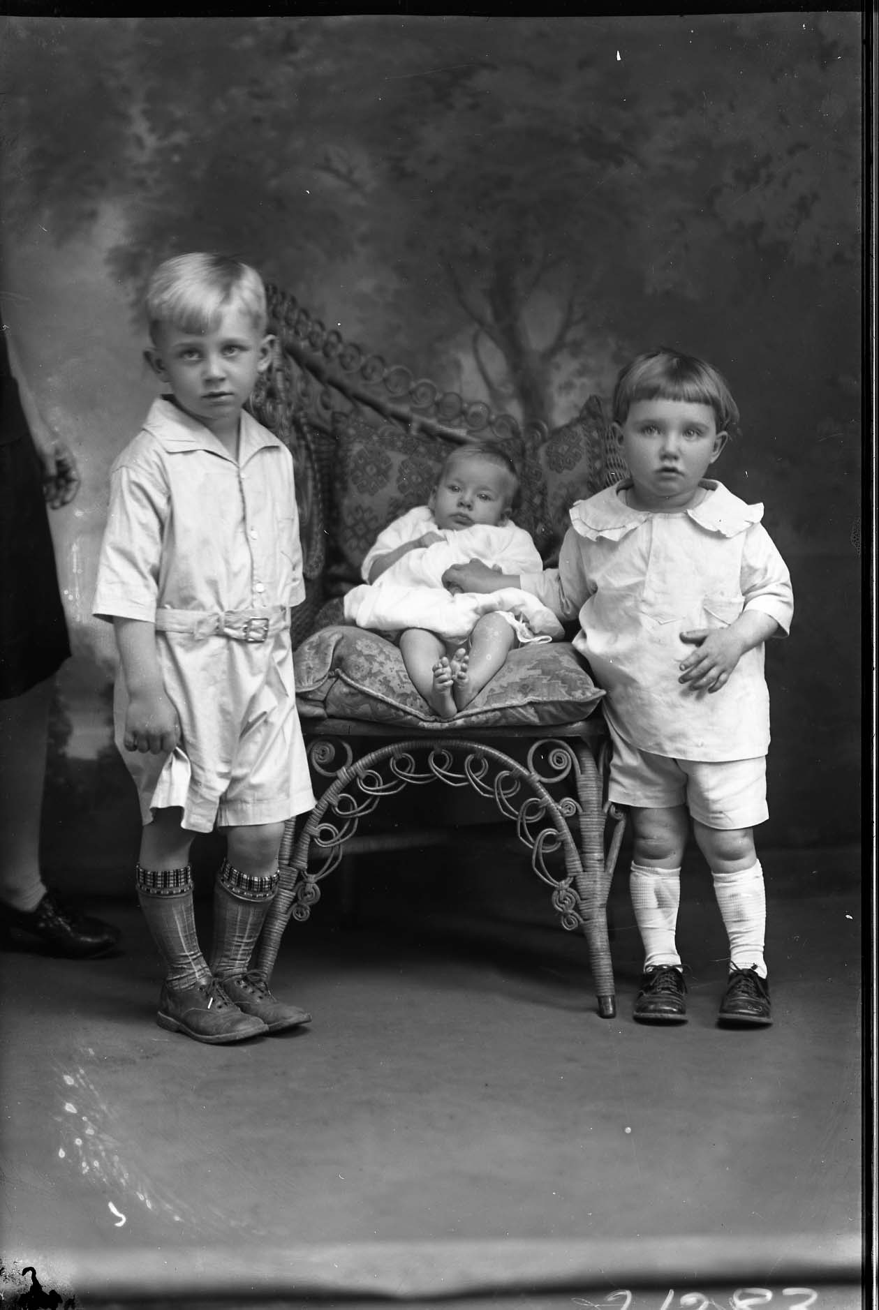 Three unidentified children of varying ages are posed together by a wicker chair.