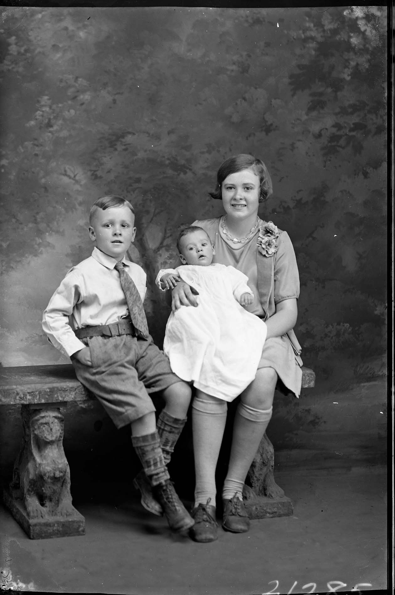 Unidentified young woman, probably teenaged, is wearing a necklace and corsage and holding a baby in her lap. A young boy is seated beside her with his hands in his pants pockets.