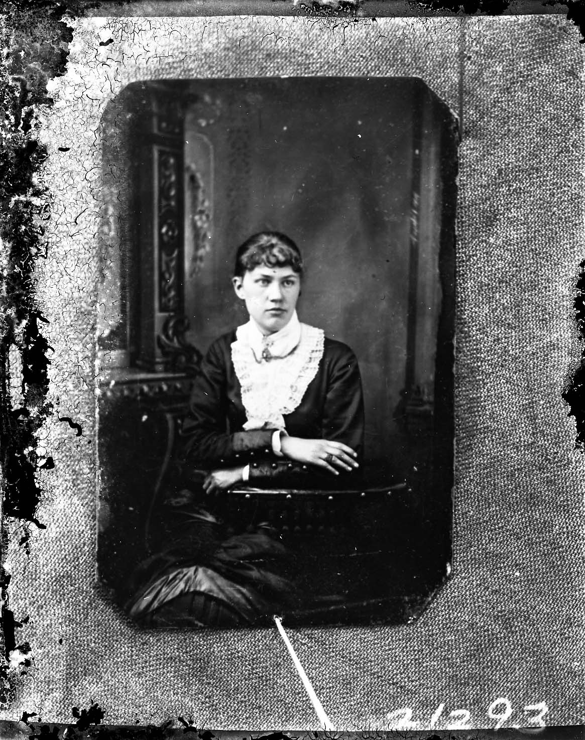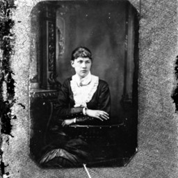 Photo of an older photograph of an unidentified woman seated in a chair with her arms folded in front of her.