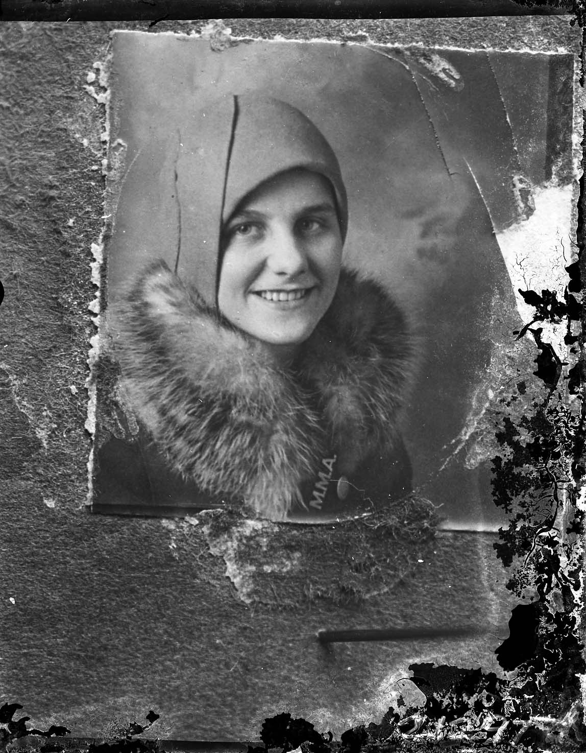 Photo of a portrait photograph of an unidentified smiling woman who is wearing a fur collar and a hat that covers all of her head.