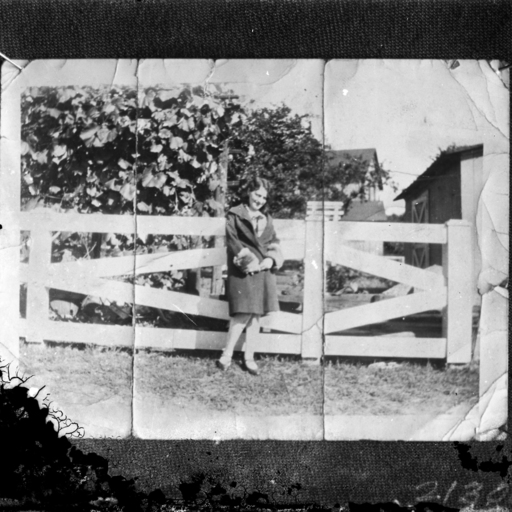 Photo of a photograph of an unidentified woman in a coat with fur sleeves is standing in front of a board fence.