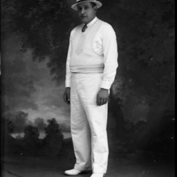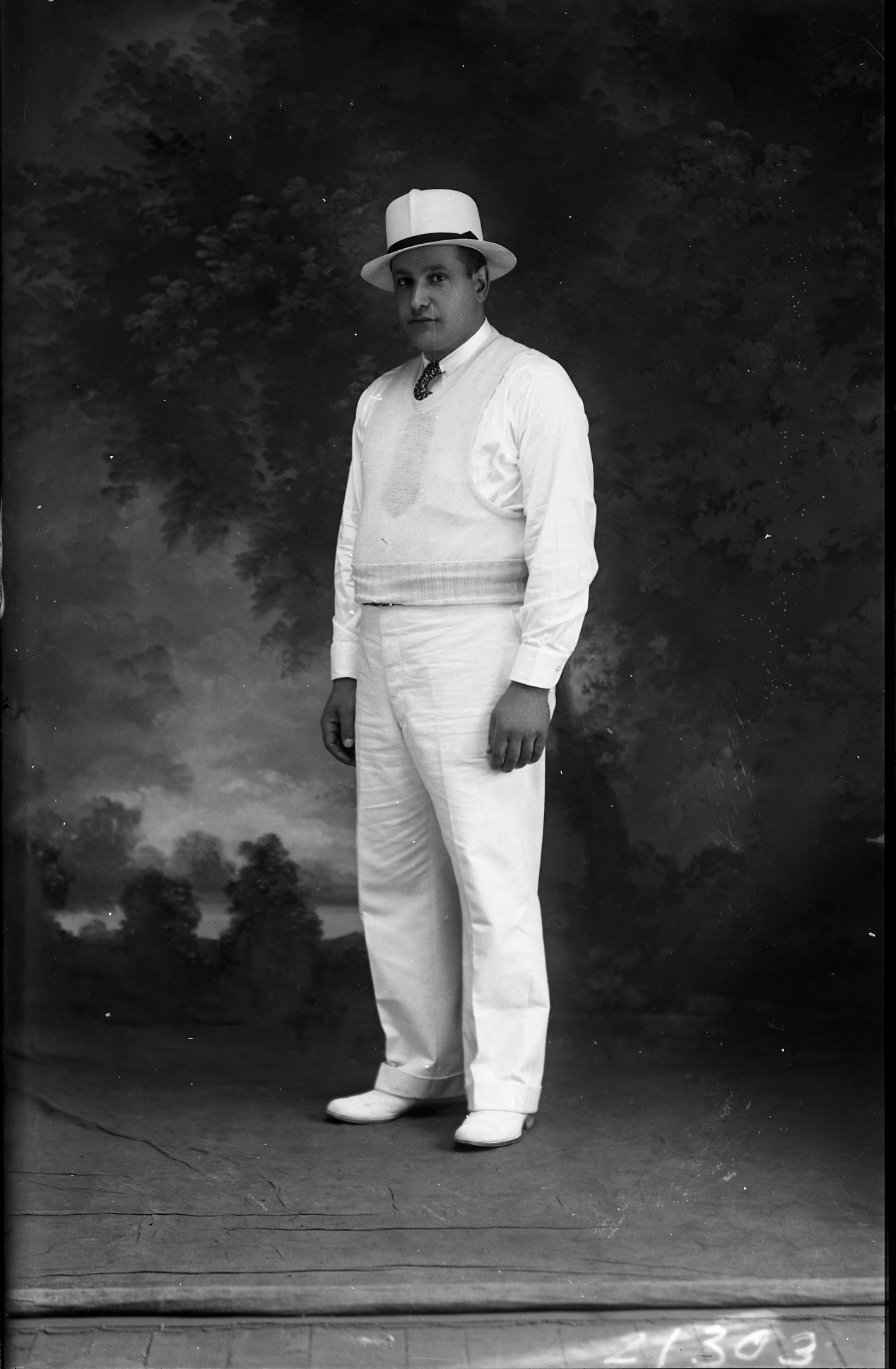 Unidentified man in a white vest, shirt and hat is wearing a dark tie and standing with his arms at his sides.