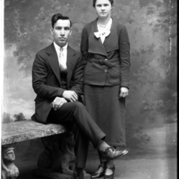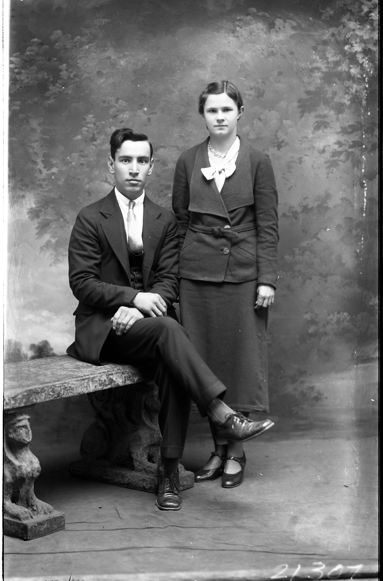 Unidentified man, seated with his legs crossed, is posed with an unidentified woman standing beside him.