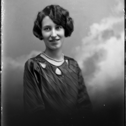 Portrait photograph of an unidentified woman with short hair is wearing faux pearls with her dress.