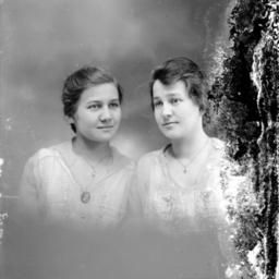 Portrait photograph of two unidentified women with their hair pulled back and both wearing necklaces with their dresses.