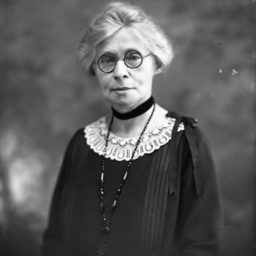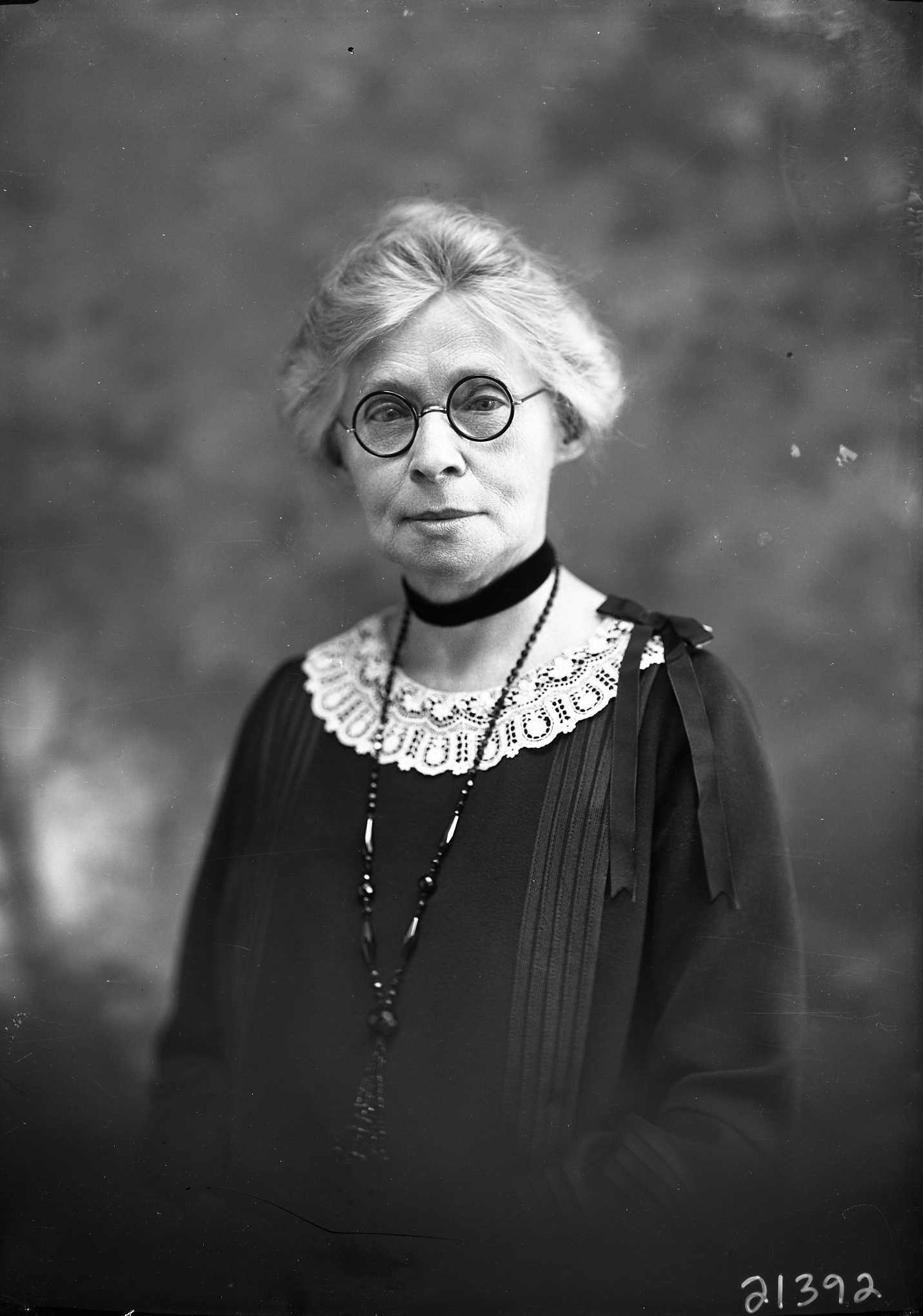 Portrait photograph of an unidentified older woman wearing glasses and a long necklace with her lace-collared dress.