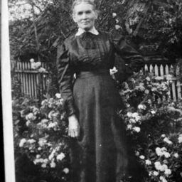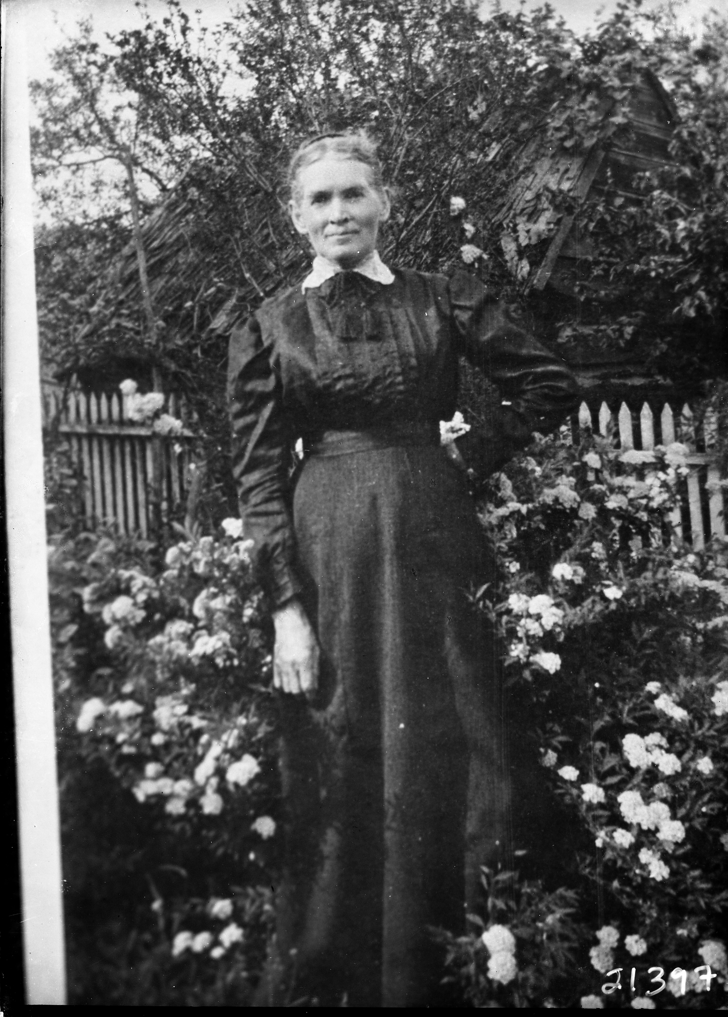 Photo of a photograph of an unidentified older woman in a long dress is standing outdoors in a yard with one hand on her hip.