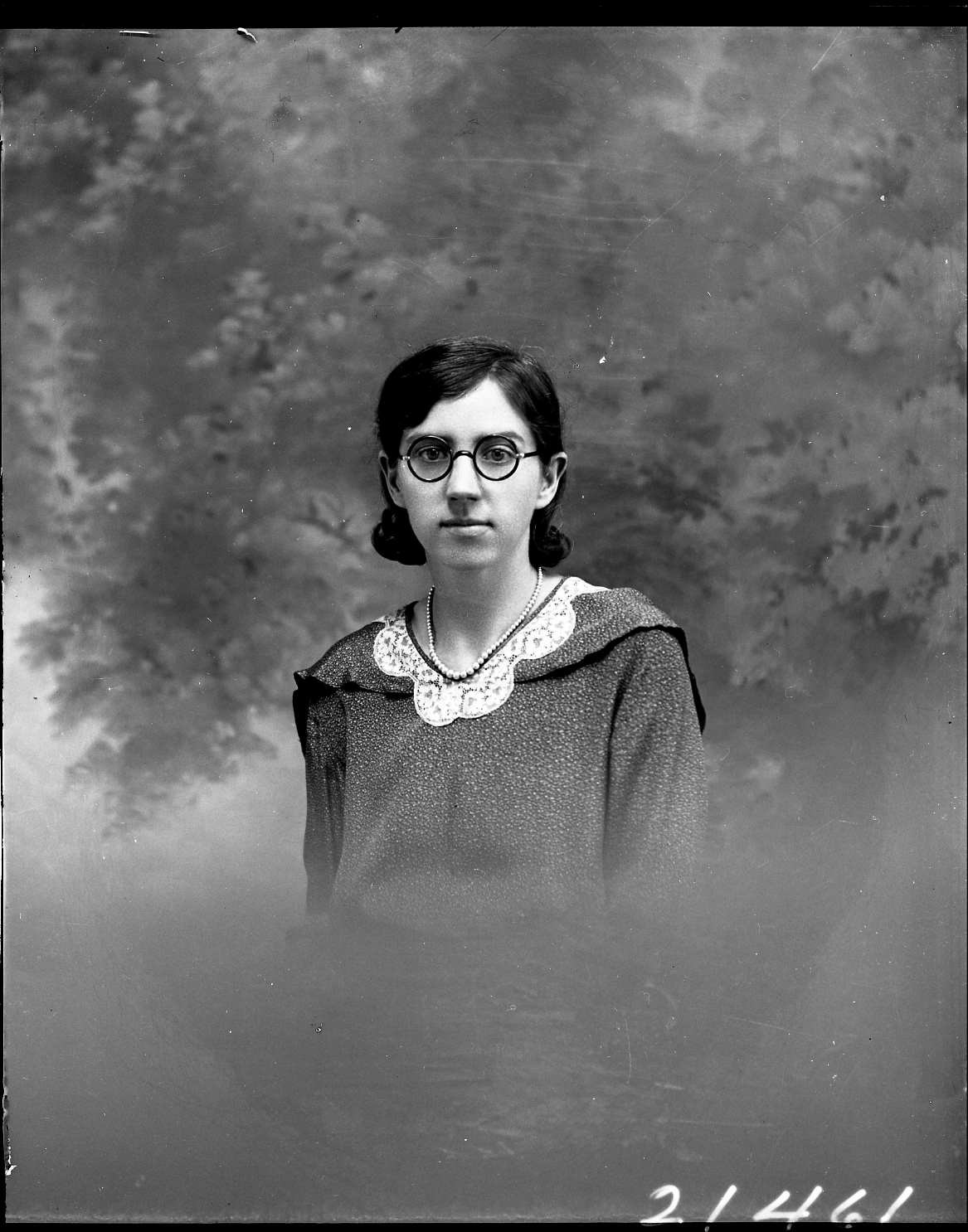 Portrait photograph of an unidentified woman in round glasses and wearing a necklace with her dress.